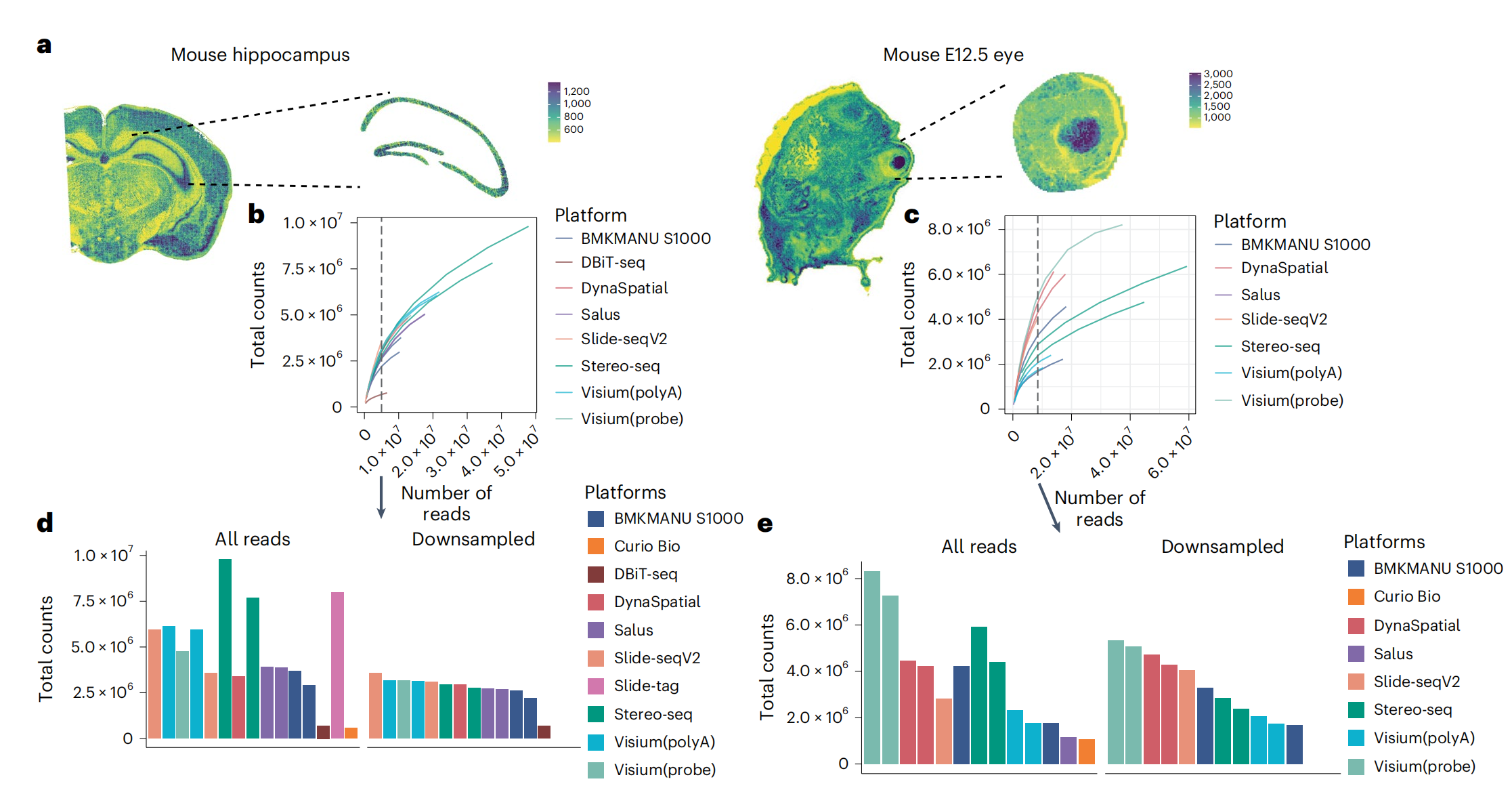 通過(guò)小鼠嗅球(Pixel-seq,Stereo-seq,Slide-seqV2),小鼠腦海馬(BMKMANU S1000,Slide-seqV2,Salus,Stereo-seq),小鼠胚胎眼球(BMKMANU S1000,Stero-seq,Slide-seqV2)經(jīng)典marker(Slc17a7、Ptgds及Pmel)的回溯來(lái)評(píng)估分子的橫向逸散問(wèn)題,發(fā)現(xiàn)BMKMANU?S1000在腦海馬的表現(xiàn)優(yōu)秀,在小鼠胚胎眼球中表現(xiàn)不足,不同的技術(shù)表現(xiàn)出的差異,文中也給出了推論:可能跟樣本切片操作及組織透化等實(shí)驗(yàn)存在關(guān)聯(lián),提示后續(xù)的研究者在樣本準(zhǔn)備及透化實(shí)驗(yàn)應(yīng)該更加的謹(jǐn)慎。
