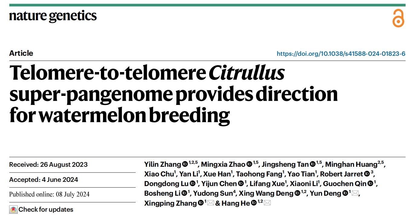 2024年7月8日,北京大學現代農業(yè)研究院在國際頂尖期刊《自然-遺傳學》上在線發(fā)表了題為Telomere-to-telomere?Citrullus?Super-pangenome Provides Direction for Watermelon Breeding的研究成果,是西瓜科研領域的重大突破。