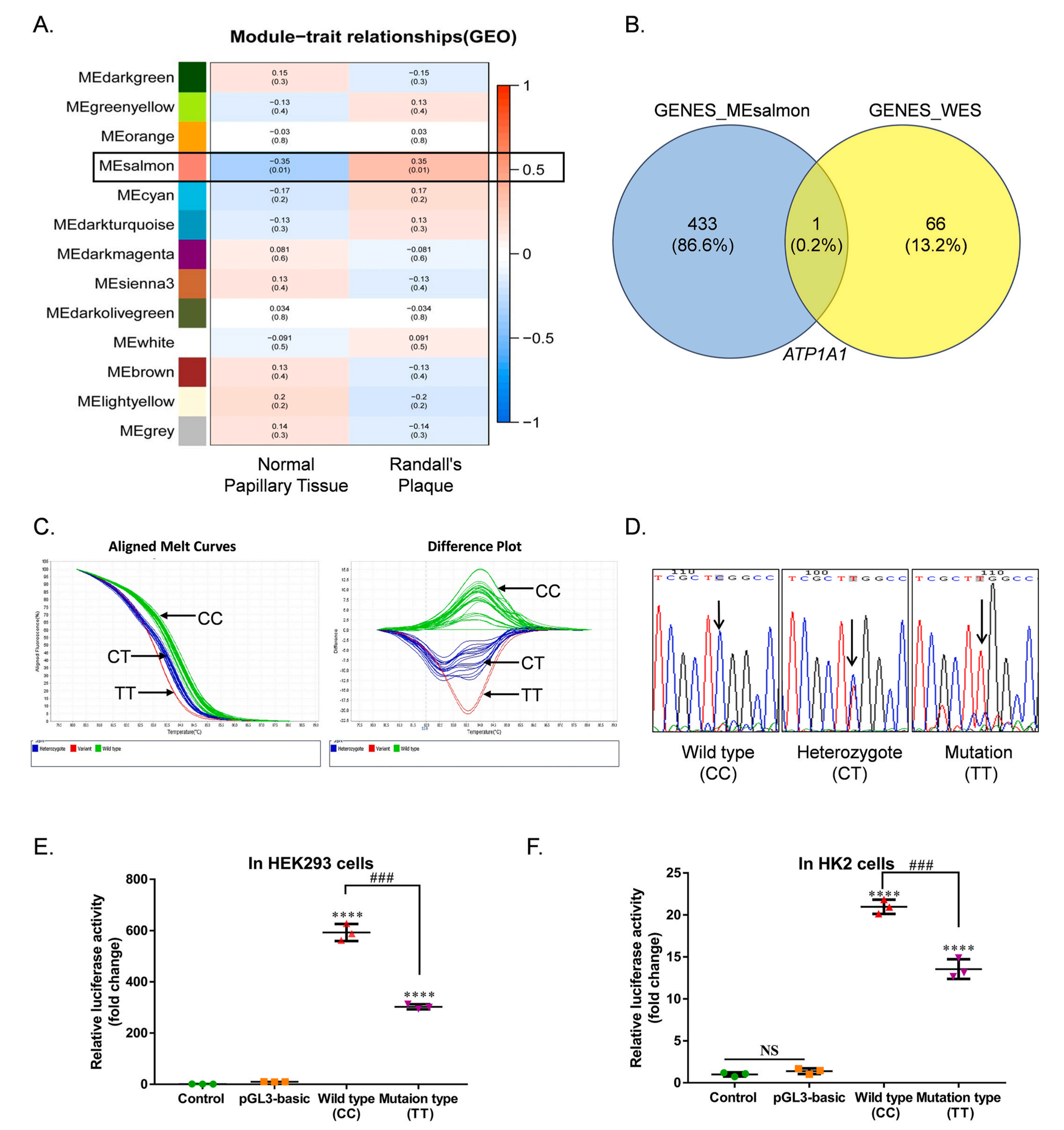 為進(jìn)一步探究腎結(jié)石相關(guān)關(guān)鍵基因,該研究對28例中國漢族CaOx結(jié)石患者進(jìn)行了WES分析,共鑒定得到76個SNPs,其中錯義SNPs31個,編碼同義SNPs30個,3′UTR7個SNPs,5′UTR區(qū)8個SNPs,作為候選SNPs,這些突變位點定位于67個基因,將這67個基因與WGCNA分析中的434個基因做韋恩圖取交集,發(fā)現(xiàn)ATP1A1是兩個數(shù)據(jù)集交叉點中的唯一基因,一定程度上說明了ATP1A1在鈣結(jié)石形成中的潛在作用。