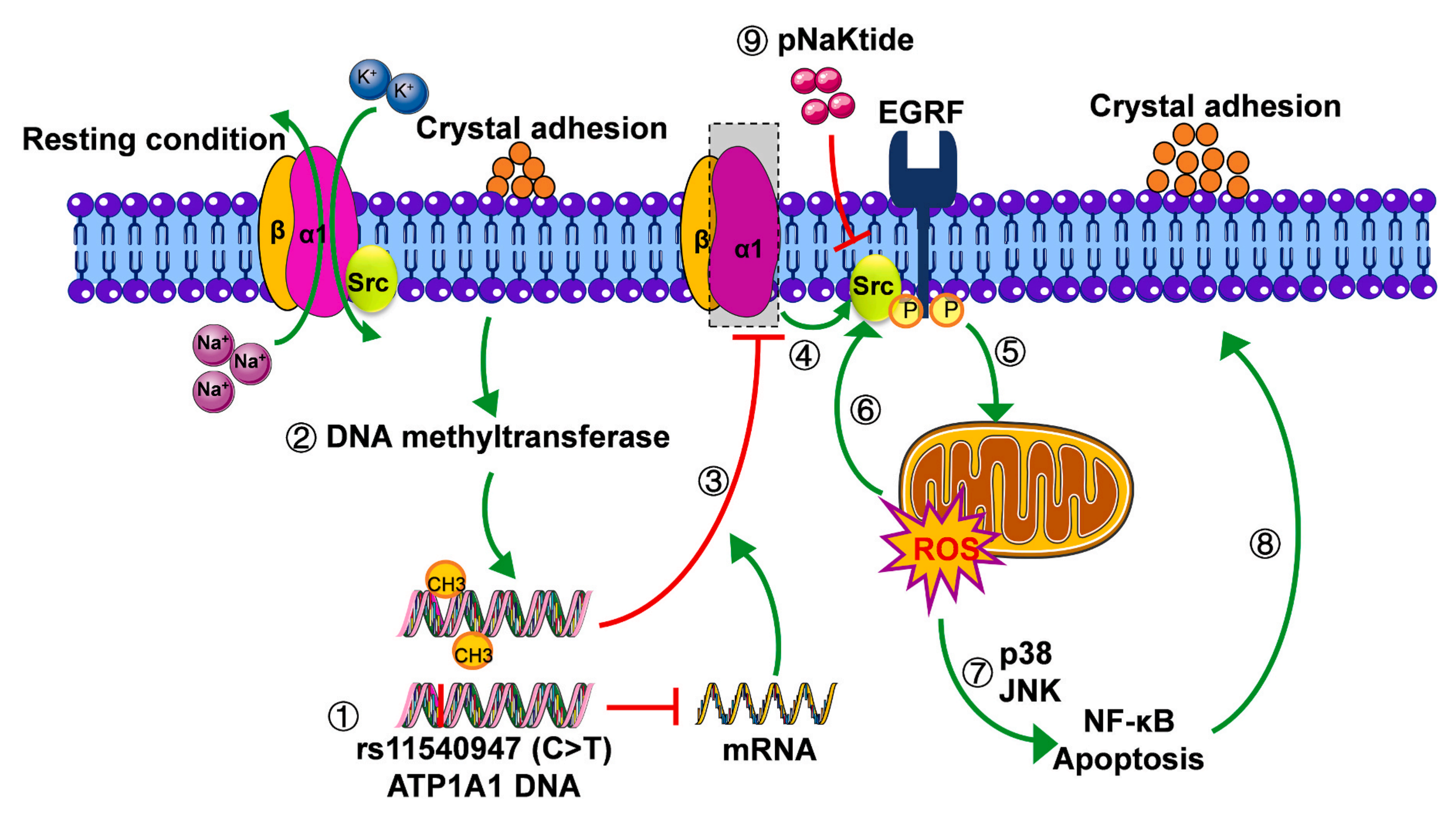 晶體與細(xì)胞的粘附是結(jié)石形成的關(guān)鍵過程,晶體沉積會損傷腎細(xì)胞,因此,作者研究了ATP1A1在晶體-細(xì)胞粘附中的作用。該研究觀察到用 Ad-hATP1A1 感染和用 pNaKtide 處理后,Ca2+濃度與對照組相比顯著降低,表明ATP1A1過表達(dá)和pNaKtide可以阻止晶體與細(xì)胞的粘附,從而保護(hù)細(xì)胞免受CaOx晶體誘導(dǎo)的損傷并減少腎結(jié)石的形成。DNA啟動子中CpG島的甲基化是基因沉默的常見機(jī)制,COM暴露后,DNA甲基轉(zhuǎn)移酶(DNMTs)的mRNA和蛋白質(zhì)水平均顯著升高,而用DNA甲基化抑制劑5Aza-2dc預(yù)處理HK2細(xì)胞再進(jìn)行COM暴露處理后,ATP1A1表達(dá)量下調(diào);ATP1A1的蛋白水平也被逆轉(zhuǎn)。這些結(jié)果表明,改變的DNA甲基化參與了COM誘導(dǎo)的ATP1A1降低。