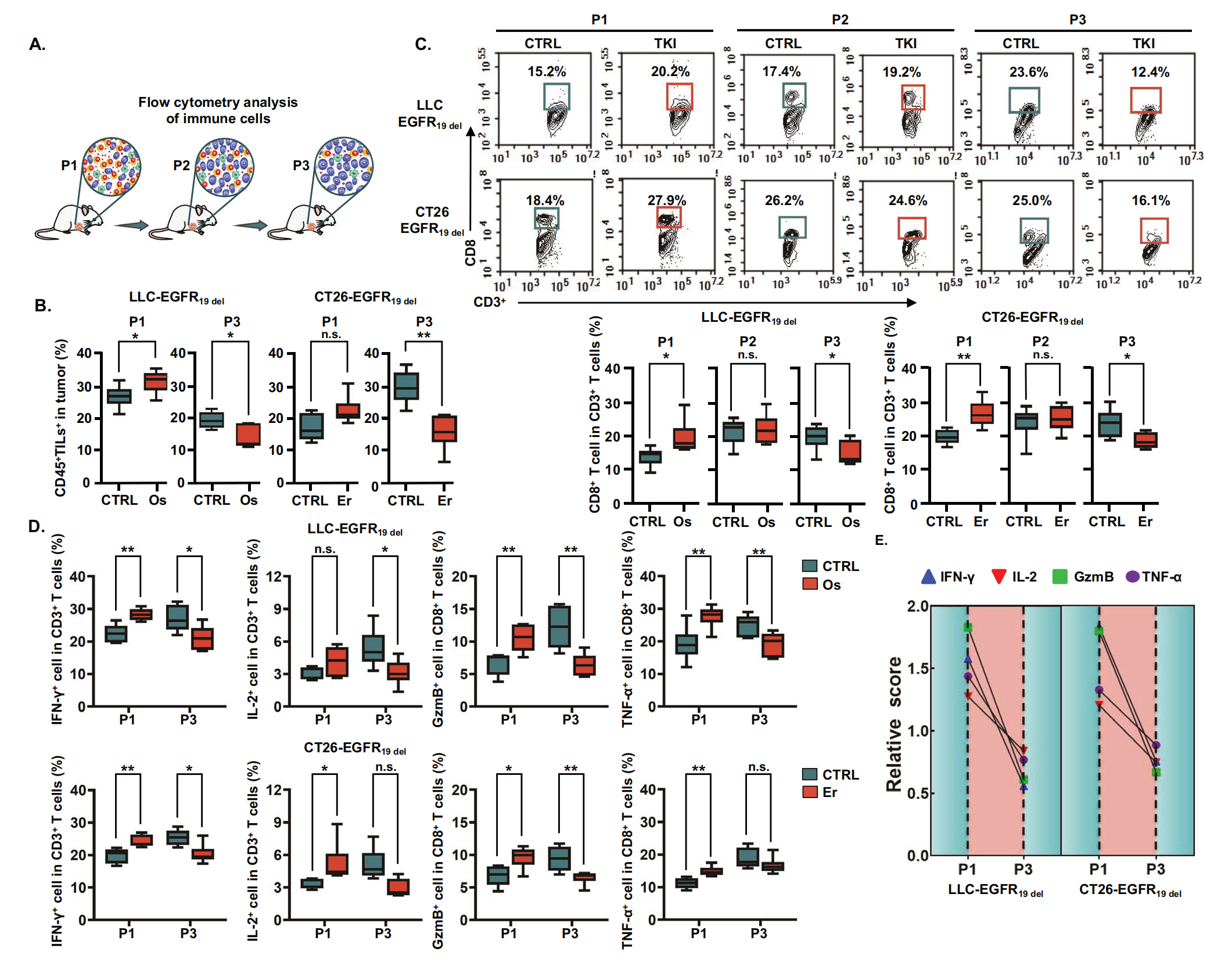 為了了解腫瘤免疫環(huán)境如何參與對(duì) EGFR-TKI 的耐藥性,作者分析了治療過(guò)程中不同階段的腫瘤免疫環(huán)境特征(圖 2A)。作者測(cè)定了初始 EGFR-TKIs 治療時(shí)和耐藥發(fā)展期間 (P1-P3) 腫瘤免疫環(huán)境中腫瘤浸潤(rùn)白細(xì)胞 (TIL) 的密度,其中用鹽水處理的腫瘤細(xì)胞作為 CTRL 組,用厄洛替尼或奧希替尼治療的腫瘤細(xì)胞作為 TKI 組。流式細(xì)胞術(shù)分析的免疫分析顯示,在治療早期,攜帶 EGFR19del?的腫瘤的 EGFR-TKIs 治療誘導(dǎo)腫瘤浸潤(rùn)白細(xì)胞比例增加(圖2B)。然而,當(dāng)荷瘤小鼠對(duì) EGFR-TKI 產(chǎn)生耐藥性時(shí),與 CTRL 組相比,腫瘤浸潤(rùn)白細(xì)胞的比例顯著降低(圖2B)。這表明荷瘤小鼠對(duì) EGFR-TKIs 的反應(yīng)性改變伴隨著腫瘤免疫環(huán)境的動(dòng)態(tài)變化。