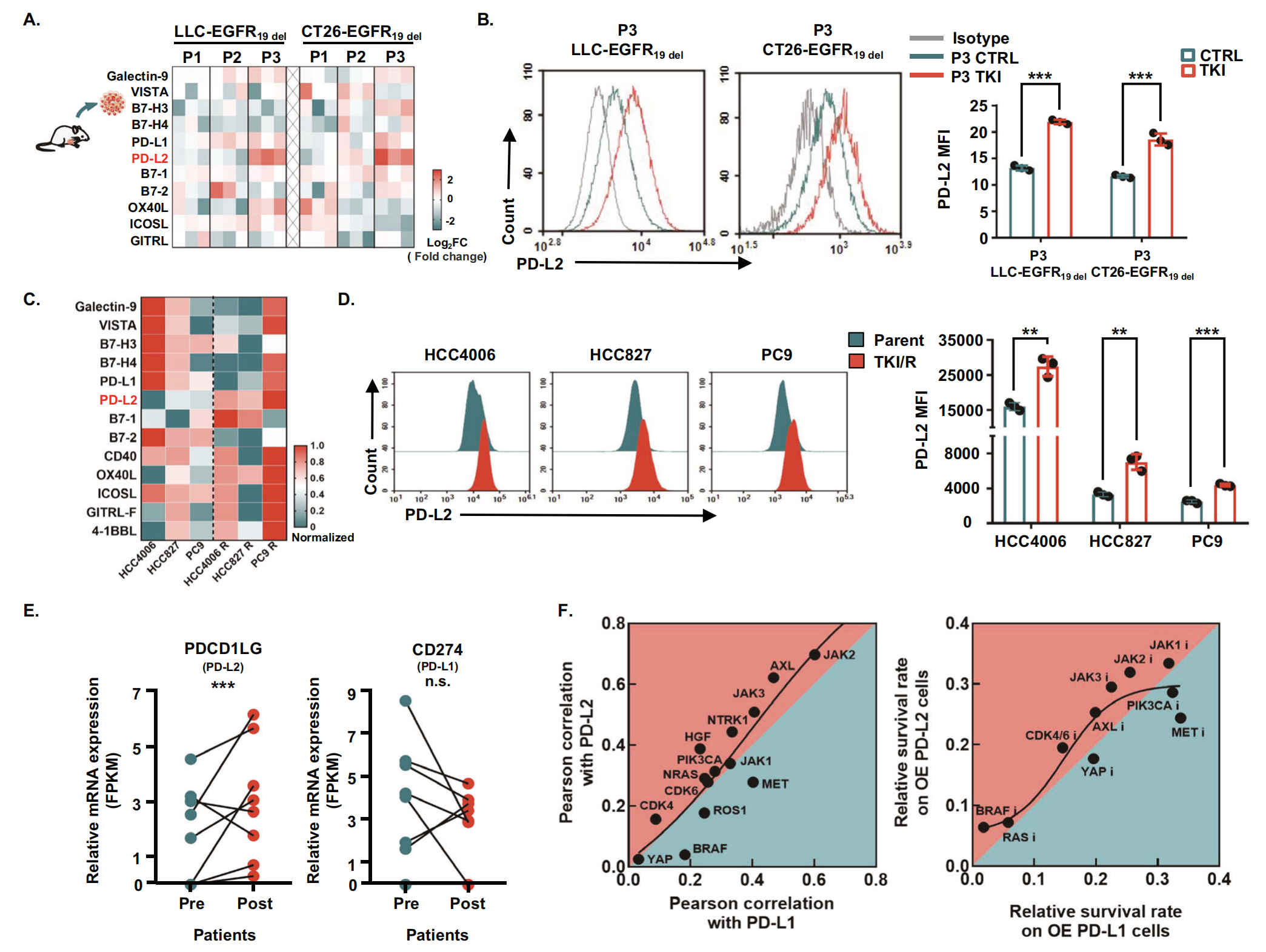 為了探索腫瘤免疫環(huán)境變化的原因,作者同時(shí)檢測(cè)了不同傳代階段腫瘤組織中刺激性和抑制性免疫調(diào)節(jié)分子的表達(dá)。在 EGFR-TKI 的初始治療中,一些抑制性免疫檢查點(diǎn)的相對(duì)表達(dá)降低(圖隨著耐藥性的出現(xiàn),抑制性免疫檢查點(diǎn)基因 PD-L1 和 PD-L2 的相對(duì)表達(dá)水平逐漸升高,尤其是 PD-L2 (圖3A)。為了進(jìn)一步驗(yàn)證 PD-L2 在 EGFR-TKI 耐藥腫瘤細(xì)胞中表達(dá)的增加,作者通過(guò)流式細(xì)胞術(shù)鑒定了 PD-L2 在 P3 腫瘤細(xì)胞厄洛替尼或奧希替尼處理的腫瘤細(xì)胞(耐藥,TKI 組)表面的表達(dá),以生理鹽水處理的細(xì)胞為對(duì)照(敏感,CTRL 組)。作者的結(jié)果表明,與對(duì)照組織相比,腫瘤細(xì)胞表面 PD-L2 的表達(dá)在耐藥腫瘤組織中表現(xiàn)出顯著增加(圖3B)。接下來(lái),為了進(jìn)一步驗(yàn)證,作者分析了先前構(gòu)建的 EGFR 突變的 TKI 耐藥 NSCLC 細(xì)胞系 HCC4006R、HCC827R、PC9R 及其配對(duì)親本細(xì)胞中免疫檢查點(diǎn)標(biāo)志物的表達(dá)水平。在三種耐藥細(xì)胞系中,PD-L2 的 mRNA 和蛋白表達(dá)水平顯著上調(diào),而 PD-L1 的表達(dá)表現(xiàn)出不一致的變化(圖3C、D)。