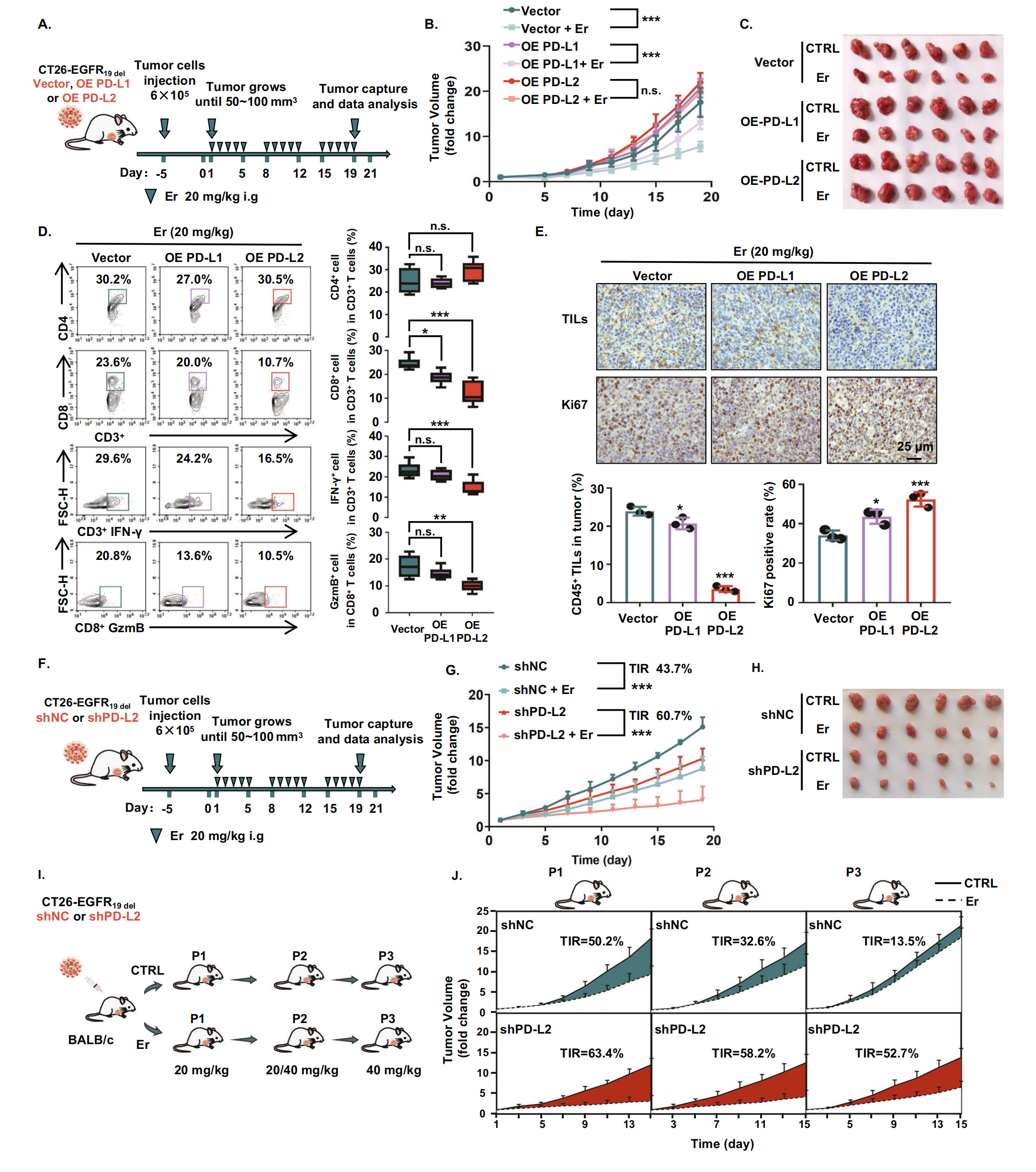 鑒于 PD-L2 在體內(nèi)調(diào)節(jié) T 細(xì)胞活性中的關(guān)鍵作用,作者通過(guò)體內(nèi)實(shí)驗(yàn)表明,PD-L2 的穩(wěn)定沉默增加了 EGFR-TKI 的敏感性(圖4F,G)。為了進(jìn)一步研究 PD-L2 如何影響對(duì) EGFR-TKI 的耐藥動(dòng)力學(xué),作者在 EGFR-TKI 耐藥同基因小鼠模型的開發(fā)中穩(wěn)定地沉默了 CT26-EGFRmut 細(xì)胞系中的 PD-L2(圖4H)。結(jié)果顯示,厄洛替尼在第一代顯著抑制 CT26-EGFR19del?衍生腫瘤的生長(zhǎng)。重要的是,PD-L2 沉默導(dǎo)致對(duì) EGFR-TKI 治療的耐藥性延遲發(fā)生。即使在第三代 (P3) 時(shí)對(duì)照組 (CT26-EGFR19del?shNC 衍生腫瘤) 出現(xiàn)耐藥性 (腫瘤抑制率 = 13.5%),PD-L2 沉默的腫瘤對(duì) EGFR-TKIs 保持高敏感性 (腫瘤抑制率 = 52.7%) (圖4I,J)。綜上所述,作者的基因操作實(shí)驗(yàn)表明,PD-L2 通過(guò)影響腫瘤免疫微環(huán)境在介導(dǎo) EGFR-TKIs 耐藥中發(fā)揮關(guān)鍵作用。