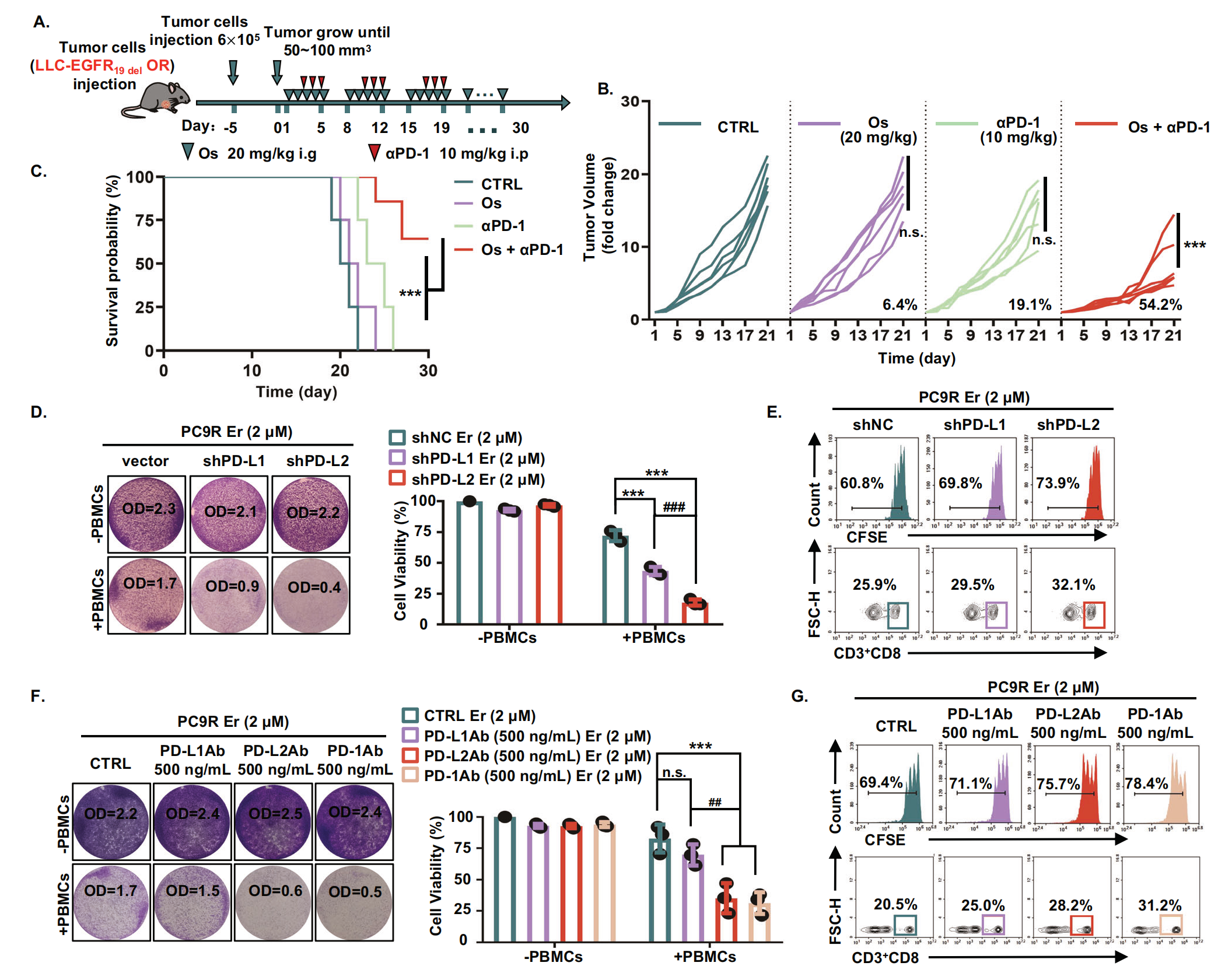 接下來(lái),作者想進(jìn)一步探討阻斷 EGFR-TKI 耐藥細(xì)胞中的 PD-L2/PD-1 是否可以通過(guò)增強(qiáng)免疫反應(yīng)來(lái)增強(qiáng)腫瘤細(xì)胞對(duì) EGFR-TKIs 的敏感性。作者建立了攜帶對(duì)奧希替尼耐藥的 LLC-EGFR19del?衍生腫瘤的同基因小鼠模型。小鼠接受生理鹽水 (CTRL)、奧希替尼 (Os)、抗 PD-1 (αPD-1) 和奧希替尼 + 抗 PD-1 (Combi) 治療(圖5A)。作者的結(jié)果表明,與 CTRL 組相比,單獨(dú)使用奧希替尼組小鼠的腫瘤體積和生存時(shí)間沒(méi)有顯著差異。PD-1 抑制劑對(duì) EGFR-TKI 耐藥腫瘤表現(xiàn)出部分抑制,并導(dǎo)致小鼠存活時(shí)間適度延長(zhǎng),盡管沒(méi)有統(tǒng)計(jì)學(xué)意義。然而,奧希替尼和抗 PD-1 的組合顯著抑制了腫瘤生長(zhǎng)并延長(zhǎng)了攜帶耐藥腫瘤的小鼠的生存期(圖5B,C)。以上結(jié)果表明,抑制 PD-1 與 EGFR-TKI 聯(lián)合有效抑制了 EGFR-TKI 耐藥腫瘤的生長(zhǎng)。