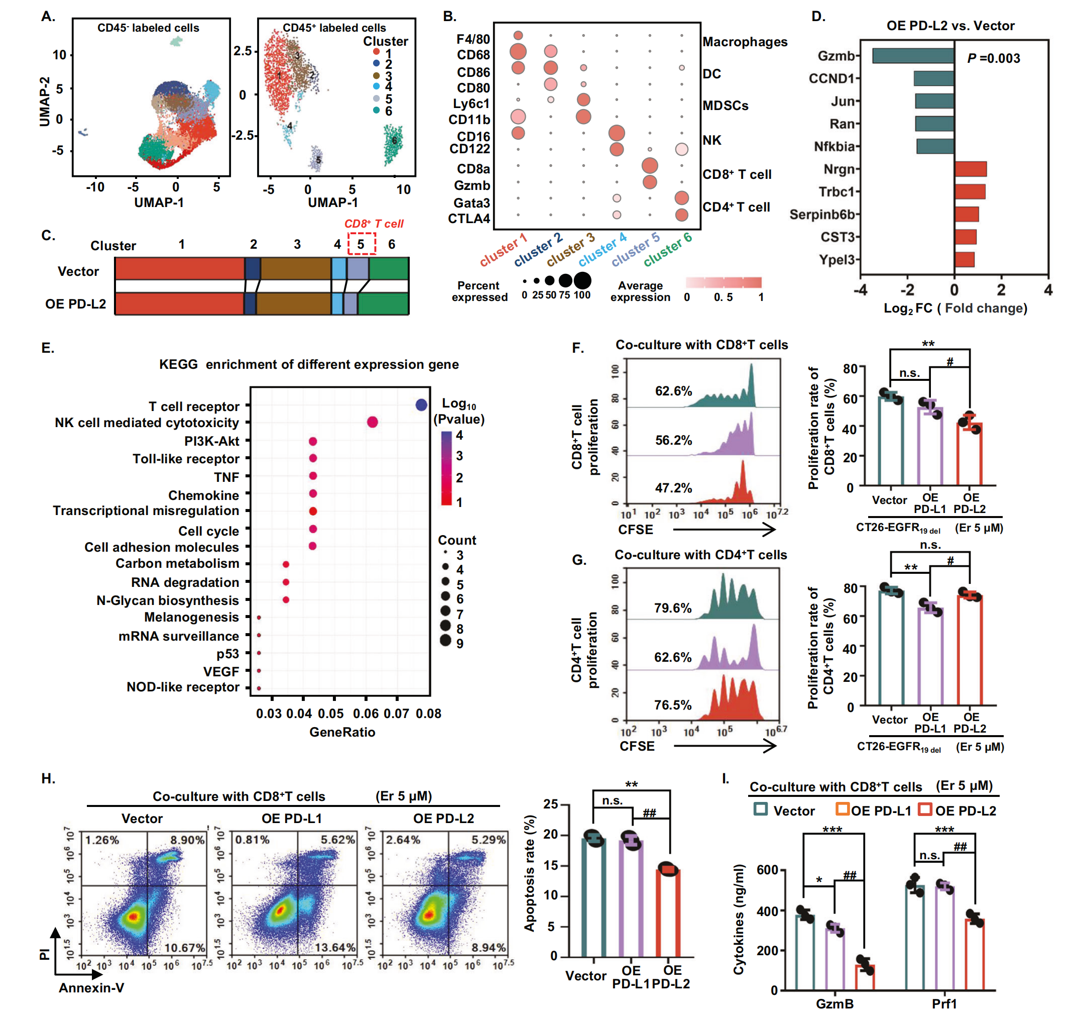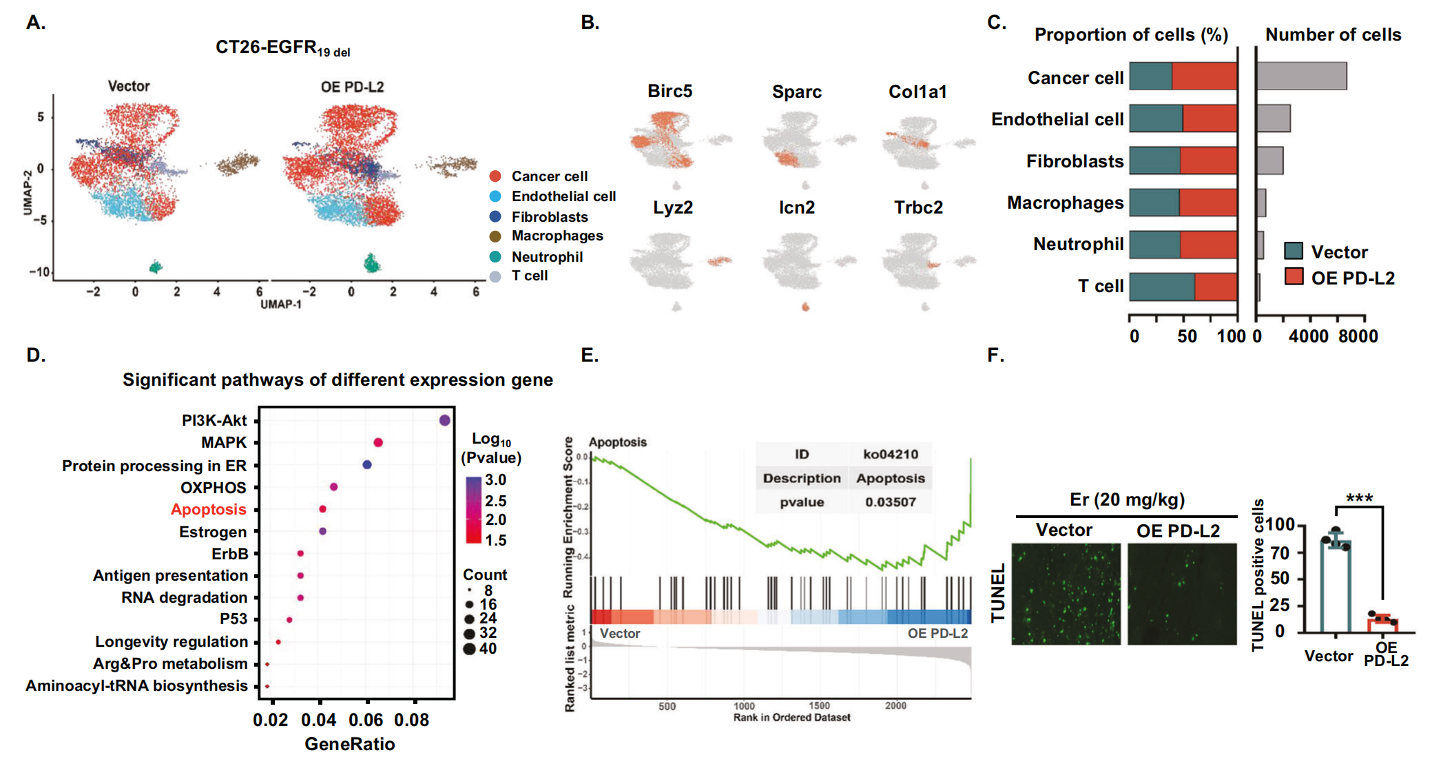 接下來(lái),作者進(jìn)一步探討了 PD-L2 表達(dá)升高影響免疫反應(yīng)以降低腫瘤對(duì) EGFR-TKIs 敏感性的機(jī)制。作者獲得了來(lái)自空載體或 PD-L2 過(guò)表達(dá)的同基因小鼠中 CT26-EGFR19del?細(xì)胞的腫瘤組織的單細(xì)胞轉(zhuǎn)錄組譜。作者對(duì)來(lái)自空載體樣本和 PD-L2 過(guò)表達(dá)樣本的整合單細(xì)胞數(shù)據(jù)集進(jìn)行了聚類分析,并確定了六個(gè)主要的不同細(xì)胞群(圖6A、B)。作者發(fā)現(xiàn) PD-L2 過(guò)表達(dá)組中癌細(xì)胞的數(shù)量顯著增加,T 細(xì)胞的比例顯著降低(圖6C)。為了探索 EGFR-TKIs 耐藥的機(jī)制,作者分析了癌細(xì)胞的轉(zhuǎn)錄組特征。與空載體組相比,對(duì) PD-L2 過(guò)表達(dá)組的差異表達(dá)基因進(jìn)行 KEGG 富集分析。作者觀察到細(xì)胞凋亡通路顯著富集(圖 6D)。GSEA 分析顯示,PD-L2 過(guò)表達(dá)組癌細(xì)胞中與細(xì)胞凋亡途徑相關(guān)的基因顯著下調(diào)(圖6E)。這些結(jié)果表明,EGFR 突變腫瘤細(xì)胞中 PD-L2 表達(dá)的增加可導(dǎo)致細(xì)胞凋亡減少。作者的體內(nèi)實(shí)驗(yàn)數(shù)據(jù)進(jìn)一步驗(yàn)證了這些結(jié)論。TUNEL 染色顯示,與對(duì)照組相比,TKI 處理后 CT26-EGFR19del?PD-L2 過(guò)表達(dá)組腫瘤細(xì)胞凋亡受到顯著抑制(圖6F)?;谶@些結(jié)果,作者假設(shè) EGFR 突變的腫瘤細(xì)胞中 PD-L2 表達(dá)增加會(huì)抑制癌細(xì)胞的凋亡,從而導(dǎo)致癌細(xì)胞的持續(xù)生長(zhǎng),耐藥性增加。