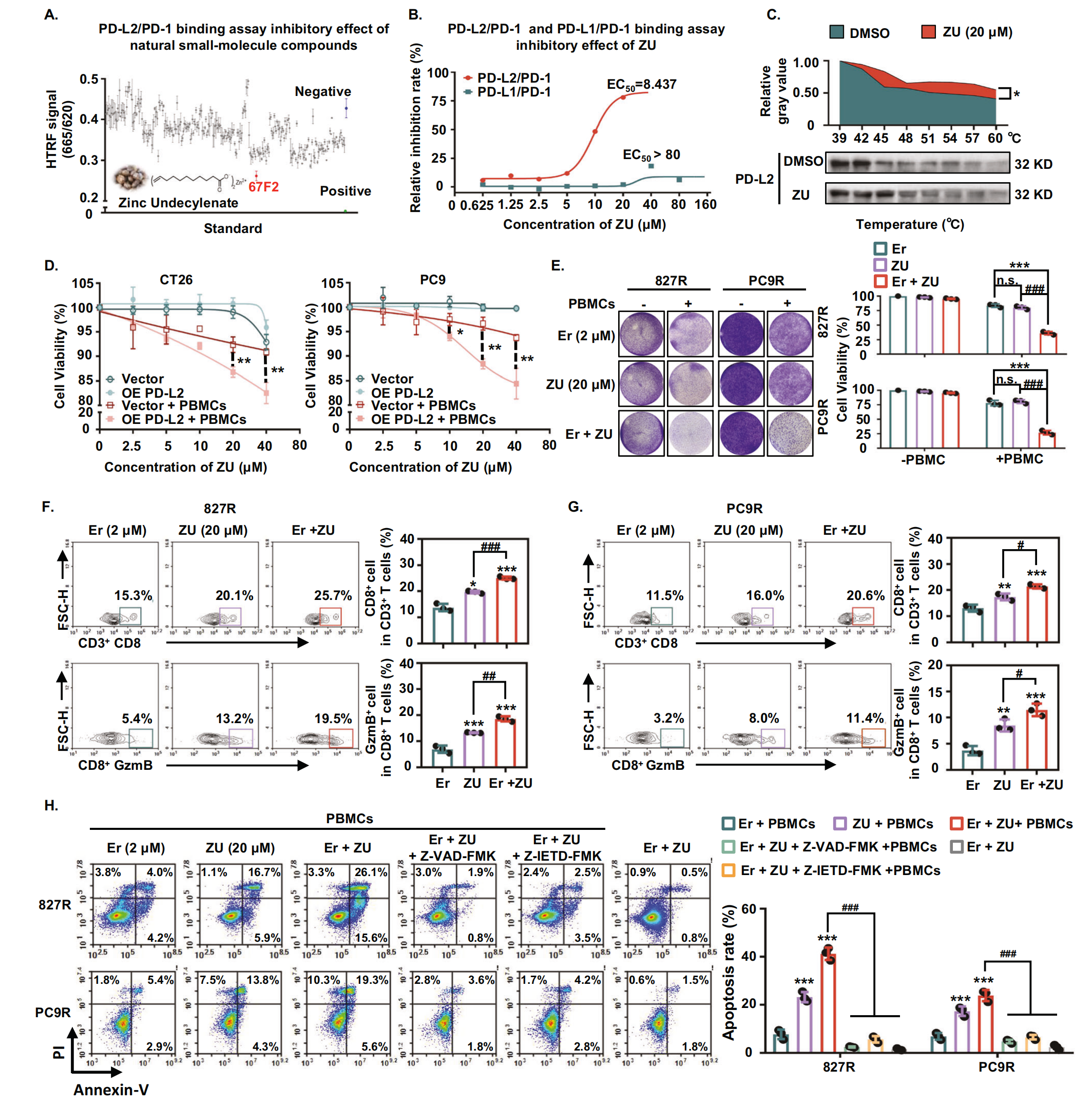 由于目前市場(chǎng)上沒(méi)有靶向 PD-L2 的藥物,作者使用 HTRF 技術(shù)篩選了 1300 多種天然小分子化合物的庫(kù),以鑒定 PD-L2 的特異性抑制劑。作者發(fā)現(xiàn)了一種小分子化合物十一烯酸鋅 (ZU),它選擇性地抑制 PD-L2/PD-1 結(jié)合,EC50?8.4 μM,而 PD-L1/PD-1 為 >80 μM(圖8A, B)。ZU 是由蓖麻油通過(guò)一系列化學(xué)反應(yīng)和凈化過(guò)程生產(chǎn)的。CETSA 實(shí)驗(yàn)表明,與 PD-L1/PD-1 相比,ZU 有效抑制了 PD-L2 與 PD-1 的結(jié)合(圖8C)。這些結(jié)果表明 ZU 具有阻斷 PD-L2/PD-1 相互作用的特異性能力。此外,作者利用空載體或 PD-L2 過(guò)表達(dá)的小鼠 CT26 細(xì)胞來(lái)驗(yàn)證 ZU 的體外抗腫瘤作用。在 40 μM 濃度下,ZU 不會(huì)顯著降低 CT26 空載體和 PD-L2 過(guò)表達(dá)細(xì)胞的活力(圖8D),這表明 ZU 沒(méi)有直接的細(xì)胞毒性作用。然而,當(dāng)腫瘤細(xì)胞與活化的 T 細(xì)胞共培養(yǎng)時(shí),與 CT26 空載體細(xì)胞相比,ZU (40 μM) 顯著抑制了 CT26 PD-L2 過(guò)表達(dá)細(xì)胞的活力(圖8D)。這表明 ZU 通過(guò)靶向 PD-L2/PD-1 的免疫調(diào)節(jié)發(fā)揮抗腫瘤作用。使用具有空載體和 PD-L2 過(guò)表達(dá)的 PC9 細(xì)胞獲得了類似的結(jié)果(圖8D)。此外,作者研究了 ZU 和 EGFR-TKI 對(duì)親本和 TKI 耐藥 NSCLC 細(xì)胞的聯(lián)合抑制作用。對(duì)于耐藥細(xì)胞,結(jié)果表明,厄洛替尼聯(lián)合 ZU 對(duì) 827 R 或 PC9R 細(xì)胞的生長(zhǎng)抑制具有協(xié)同作用,與單獨(dú)使用厄洛替尼相比,耐藥細(xì)胞的存活率顯著降低(圖8E)。重要的是,在沒(méi)有活化的 T 細(xì)胞的情況下,厄洛替尼聯(lián)合 ZU 的細(xì)胞殺傷效果沒(méi)有顯著差異(圖8E)。上述結(jié)果進(jìn)一步表明,靶向 PD-L2 的 ZU 與 EGFR-TKI 的組合對(duì)耐藥腫瘤表現(xiàn)出協(xié)同抑制作用。