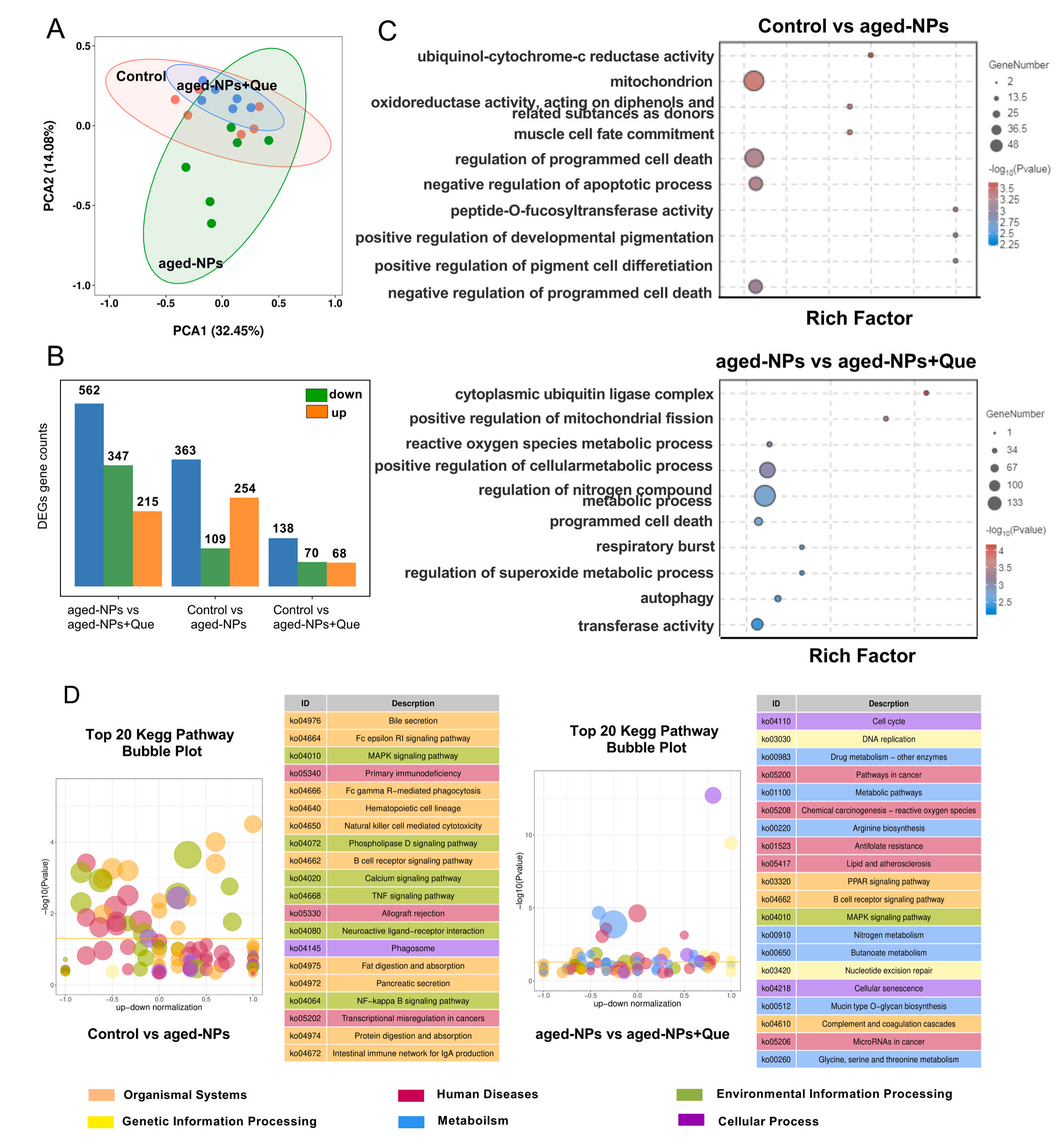 細胞成分中最突出的基因Term是線粒體,鑒定出45個DEGs,值得注意的是,老化的NPs影響了與氧化還原酶活性和泛醌細胞色素-c還原酶活性相關的活性,這些發(fā)現(xiàn)表明,老化的NPs會導致氧化應激、線粒體損傷和細胞凋亡,線粒體損傷激活線粒體凋亡通路,該通路在凋亡中起著重要作用,表明老化的NPs激活線粒體凋亡通路,最終導致細胞凋亡。而增加Que后,差異基因顯著細胞代謝和細胞分解中,如氮化合物代謝、轉移酶活性、正調控DNA修復等,KEGG富集結果顯示,老化NPs組差異基因參與信號轉導、免疫系統(tǒng)、癌癥、轉運和轉分解代謝等通路,Que治療后癌癥的細胞代謝途徑和途徑顯著富集,此外,Que干預改變了自由基代謝,如化學致癌-活性氧和GSH代謝,qPCR結果驗證了相關基因表達。