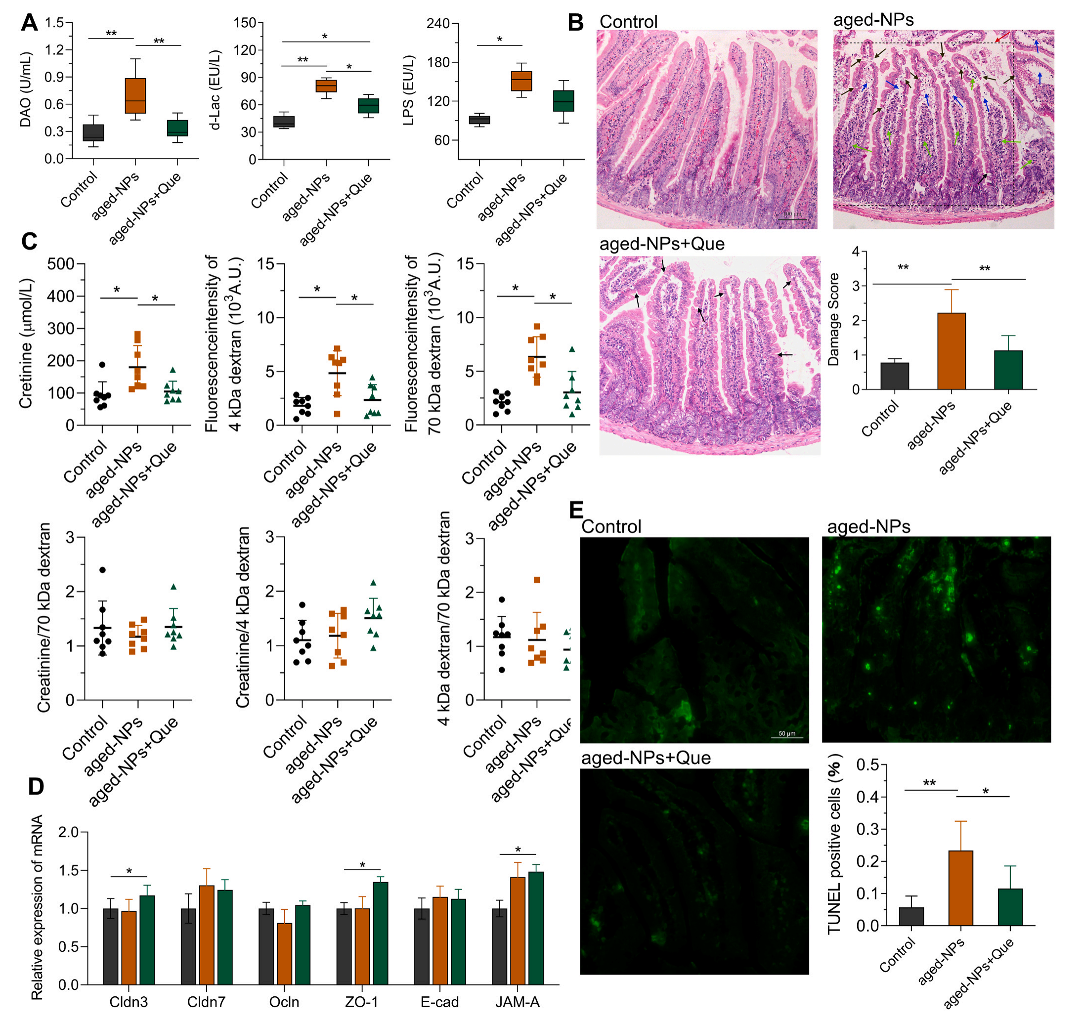 組織病理學結果顯示,老化NPs組的血清DAO、d-Lac和LPS水平顯著高于對照組,說明老化NPs誘導的腸道通透性增加,而Que降低了這些升高的水平,恢復了腸道屏障的完整性。形態(tài)學結果顯示老化NPs組的腸絨毛結構有萎縮、變形、長度減少等結構損傷,Que治療可減輕老化NPs引起的組織學損傷,促進腸腺體恢復,保留絨毛形態(tài),減少淋巴細胞浸潤,值得注意的是,Que保護了腸道內部結構,但對腸上皮和管腔之間的界面影響較小。