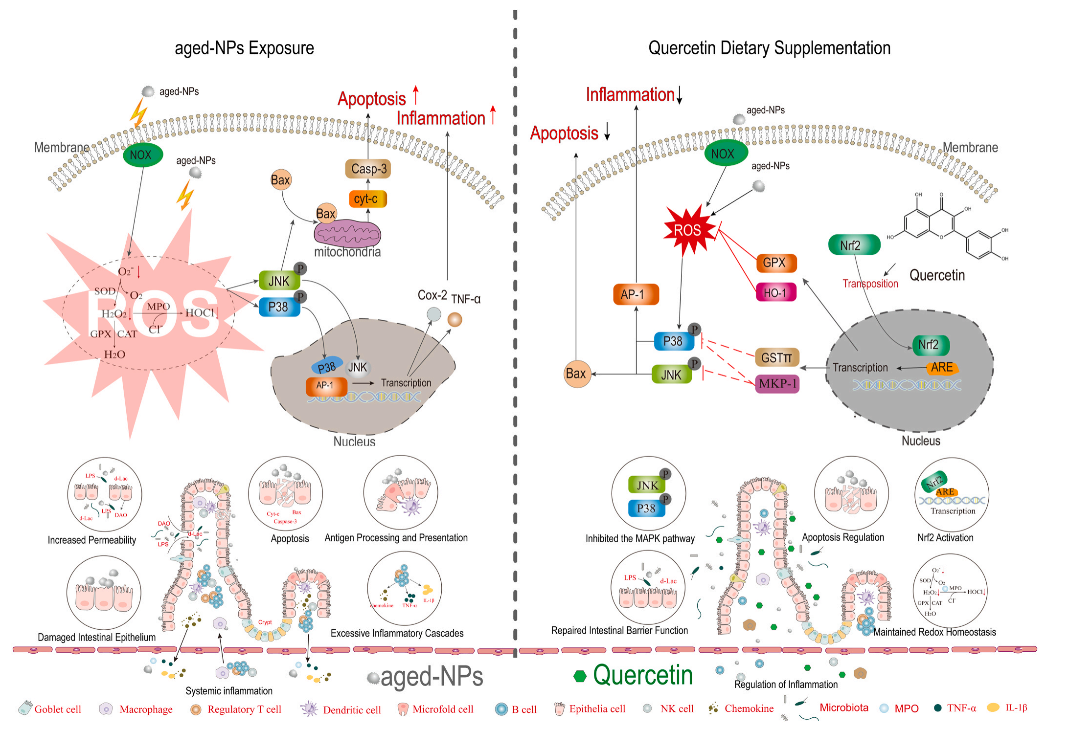 血清肌酐等指標結果顯示,老化NPs刺激顯著增加了血清中標記物的水平,表明細胞旁通透性增強,Que減弱了細胞旁通透性,恢復了接近對照的標記水平,這些結果說明腸道屏障的破裂主要歸因于腸上皮細胞的丟失和死亡,而不是緊密連接的破壞。磨蝕效應和程序性細胞死亡可能為損傷的主要原因。TUNEL結果顯示,與對照組相比,老化NPs組的熒光標記細胞更多,而老化NPs+Que染色的上皮細胞數(shù)量減少,表明Que對上皮細胞凋亡具有保護作用。JNK通路的激活通過bax-線粒體途徑促進細胞凋亡,MAPK信號通路是KEGG富集通路之一,它在細胞凋亡過程中起著至關重要的作用,p-JNK作為MAPK通路的一個主要分支,p-JNK在老化NPs組顯著增強,此外,衰老的nps也增加了JNK的靶蛋白c-Jun的磷酸化水平,結果表明,老化NPs通過JNK信號通路激活bax-線粒體凋亡通路,從而誘導細胞凋亡。在老化NPs處理中,DHE染色顯示出較高的紅色熒光密度和明顯的亮點,表明ROS水平較高,而在老化NPs+Que中沒有,添加Que顯著降低了老化NPs處理后高過氧化氫和?O2-的存在,NOX活性測定結果顯示,與對照組相比,老化NPs和老化NPs+Que處理均導致NOX活性增加,且之間無顯著差異,表明Que的主要作用是作為一種自由基清除劑,而不是一種自由基生成的抑制劑。
