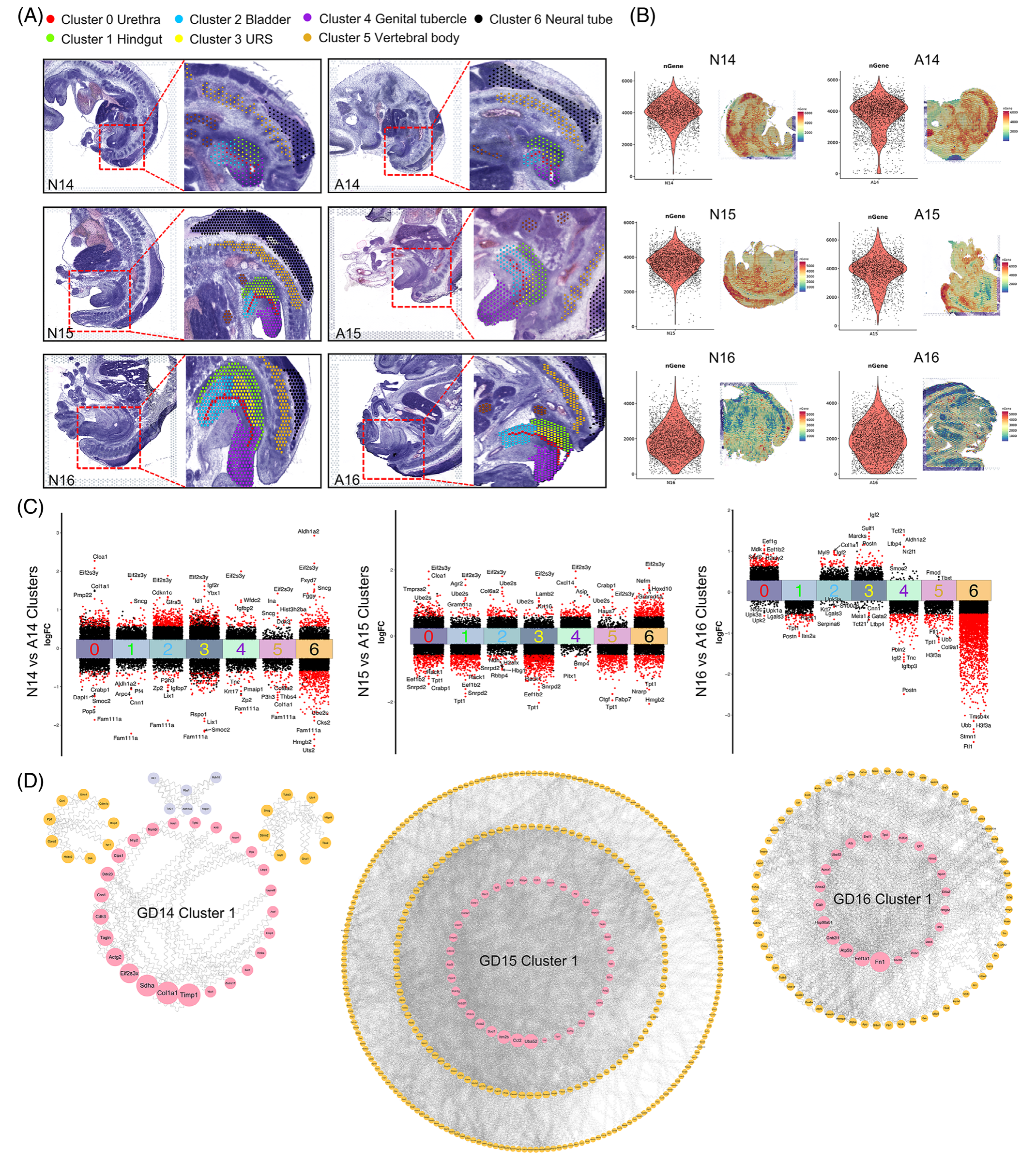 在這項(xiàng)研究中,作者在 GDs 14-16 (稱為 N14-16) 上使用正常的 Wistar 大鼠胚胎,在 GDs 14-16 (稱為 A14-16) 上使用 ETU 誘導(dǎo)的 ARM 胚胎進(jìn)行空間轉(zhuǎn)錄組測序。制備大鼠胚胎的 6 個(gè)冷凍中矢狀切片,每個(gè) 10 μm 厚。這些切片包括尿道和后腸層,提供了特定時(shí)間點(diǎn)泄殖腔發(fā)育的全面視圖(圖 1A)。使用 10× Genomics Visium 空間轉(zhuǎn)錄組技術(shù),然后進(jìn)行組織透化、cDNA 合成和文庫構(gòu)建,作者成功地捕獲了正常和 ARM 胚胎中的視覺基因轉(zhuǎn)錄數(shù)據(jù),主要來自泄殖腔區(qū)域。為了確保來自同一區(qū)域的各種切片樣本之間的可比性和一致性,作者進(jìn)行了聚類注釋,產(chǎn)生了七個(gè)不同的聚類。這些集群包括泄殖腔區(qū)域內(nèi)的五個(gè)特定區(qū)域(集群 0-4),即尿道、后腸、膀胱、URS 和生殖器結(jié)節(jié)。此外,兩個(gè)簇 (簇 5 和 6) 對(duì)應(yīng)于椎體和神經(jīng)管區(qū)域 (圖 1A)。平均而言,每個(gè)解剖區(qū)域覆蓋 3005 個(gè)點(diǎn),每個(gè)點(diǎn)捕獲 16,905 個(gè)基因(圖 1B)。