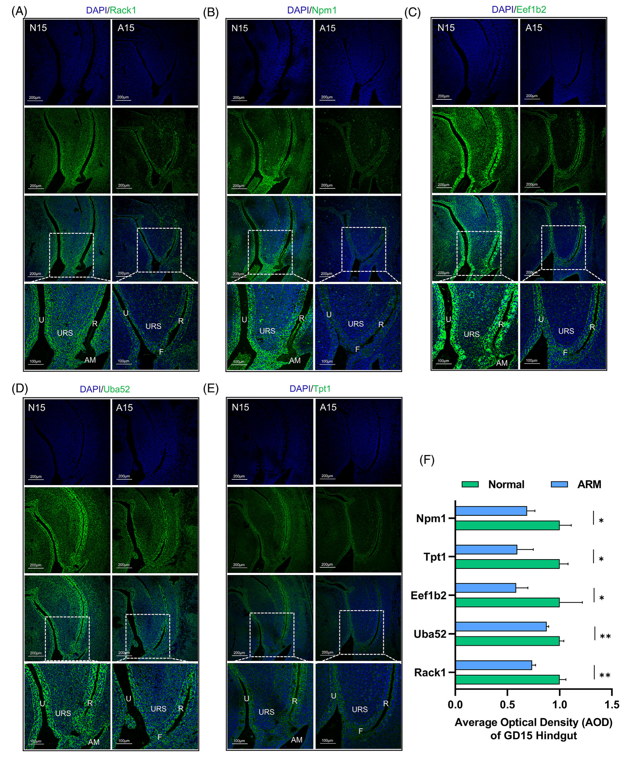 圖 2A-E 全面說明了 GD15 截面泄殖腔區(qū)域中前五個(gè)基因的蛋白質(zhì)表達(dá)模式和定位:Rack1、Npm1、Eef1b2、Uba52?和?Tpt1。這些數(shù)字是使用免疫熒光染色獲得的。值得注意的是,這 5 種蛋白質(zhì)在 N15 泄殖腔區(qū)域的尿道和后腸上皮內(nèi)均表現(xiàn)出位點(diǎn)特異性表達(dá)。除?Tpt1?外,其他 4 種蛋白在 AM 區(qū)域內(nèi)表現(xiàn)出表達(dá)水平升高。此外,觀察到這些蛋白質(zhì)離散分布在 URS 的下肢和后腸的間質(zhì)附近。相比之下,這五種蛋白的表達(dá)在 A15 泄殖腔區(qū)域的尿道和后腸上皮內(nèi)明顯下降,伴隨著尿道直瘺部位的表達(dá)水平降低 (p < 0.05)。圖 2F 顯示了平均光密度 (AOD) 的半定量評(píng)估,特別是在后腸結(jié)構(gòu)域內(nèi)。