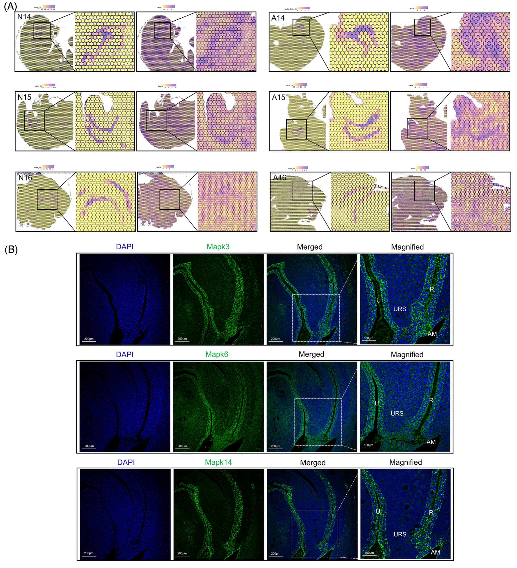 PROGENy 算法用于通過下游基因表達(dá)的變化評(píng)估信號(hào)通路的活性。作者獲得了正常組和 ARM 組 GDs 14-16 樣本中不同通路的活性水平評(píng)分。在使用 NNMF 對(duì)后腸區(qū)域(N14 因子 16、A14 因子 15、N15 因子 15、A15 因子 20、N16 因子 18 和 A16 因子 10)進(jìn)行聚類分析中,PROGENy 算法顯示與 MAPK 信號(hào)通路呈強(qiáng)正相關(guān),表明 MAPK 信號(hào)在后腸中顯著富集(圖 3A)。從這些區(qū)域提取來自 Erk、P38、JNK 和 Erk5 家族的 12 個(gè)成員分子的定位表達(dá)模式。具體來說,Mapk3 、 Mapk6 和 Mapk14 主要富集在泄殖腔區(qū)域。這些蛋白質(zhì)的免疫熒光驗(yàn)證證實(shí)了它們?cè)谀虻篮秃竽c區(qū)域的特異性表達(dá),在 URS 和間質(zhì)區(qū)域的表達(dá)相對(duì)較弱,這與 PROGENy 預(yù)測一致(圖 3B)。