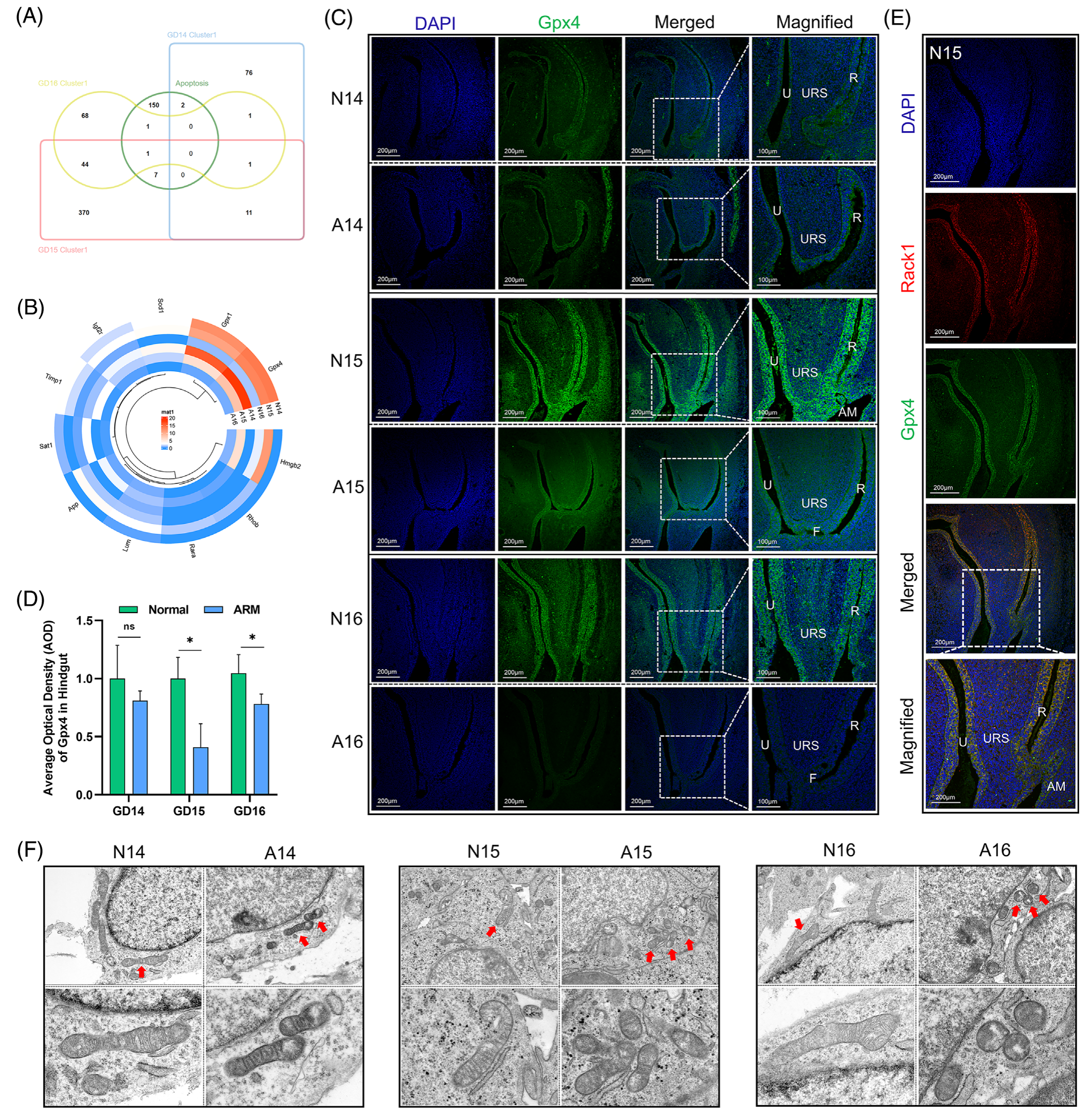 在基因集富集分析(GSEA)數(shù)據(jù)庫中,細(xì)胞死亡基因集包含161個(gè)基因,其中 7 個(gè)細(xì)胞死亡相關(guān)基因是從基因集與GD 15上簇1中的 DEGs 交集中獲得的(圖 4A)。圓形熱圖顯示了與聚類1的6個(gè)樣本相同區(qū)域內(nèi)的細(xì)胞死亡基因的表達(dá)譜。值得注意的是,發(fā)現(xiàn)谷胱甘肽過氧化物酶家族的關(guān)鍵成員?Gpx4?在 GD 15 的簇 1 中下調(diào)(p < 0.05;圖 4B)。免疫熒光染色顯示 Gpx4 蛋白在尿道和后腸上皮以及 AM 區(qū)域的顯著定位,在 URS 中觀察到的分布相對(duì)較淺。在 ARM 組的泄殖腔中觀察到 Gpx4 陽性信號(hào)的減少(圖 4C)。AOD 分析表明,在 GDs 15 和 16 上,后腸中 Gpx4 表達(dá)在統(tǒng)計(jì)學(xué)上顯著降低(p < 0.05;圖 4D)。