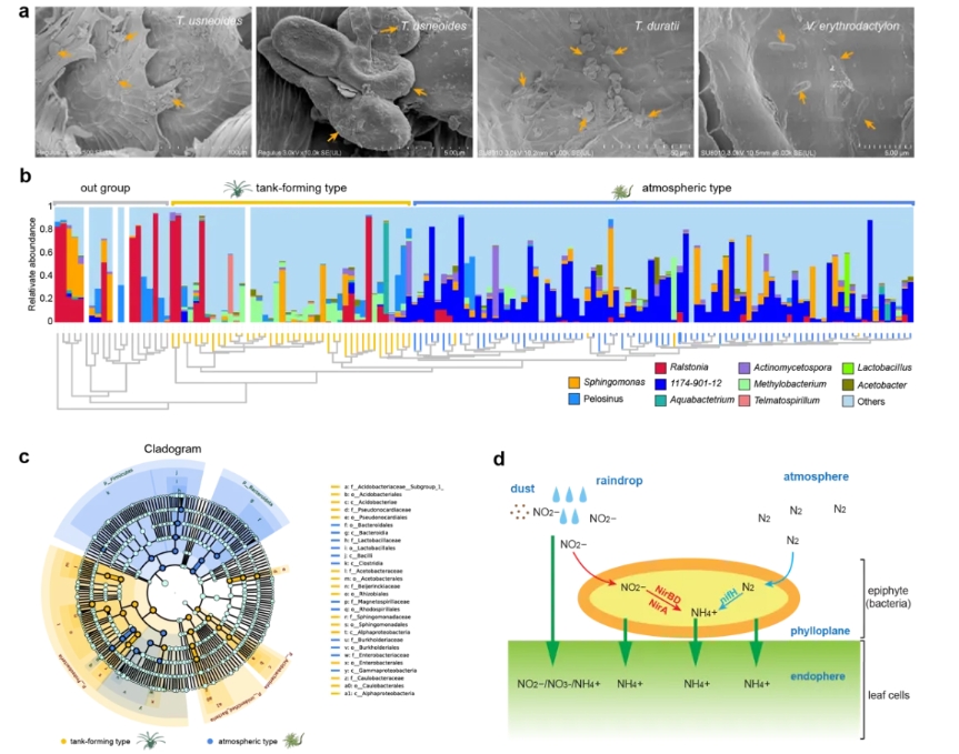 在解決了水分吸收問(wèn)題后,另一個(gè)對(duì)空氣植物生存至關(guān)重要的問(wèn)題是養(yǎng)分問(wèn)題。研究人員通過(guò)16S rRNA測(cè)序和宏基因組分析,發(fā)現(xiàn)空氣鳳梨葉表附生了大量固氮細(xì)菌(圖7a),且這些細(xì)菌具有特異性,特別是1174-901-12屬細(xì)菌,專(zhuān)一性地附生在空氣鳳梨的葉表,并且在細(xì)菌類(lèi)群中占據(jù)主要地位,可能與空氣鳳梨共進(jìn)化(圖7b-c)。此外,固氮酶nifA和nifH的發(fā)現(xiàn)進(jìn)一步證實(shí)了這些細(xì)菌的固氮能力(圖7d)。這些固氮細(xì)菌可能成為空氣植物的主要氮源,尤其在營(yíng)養(yǎng)匱乏的空中環(huán)境中尤為重要。