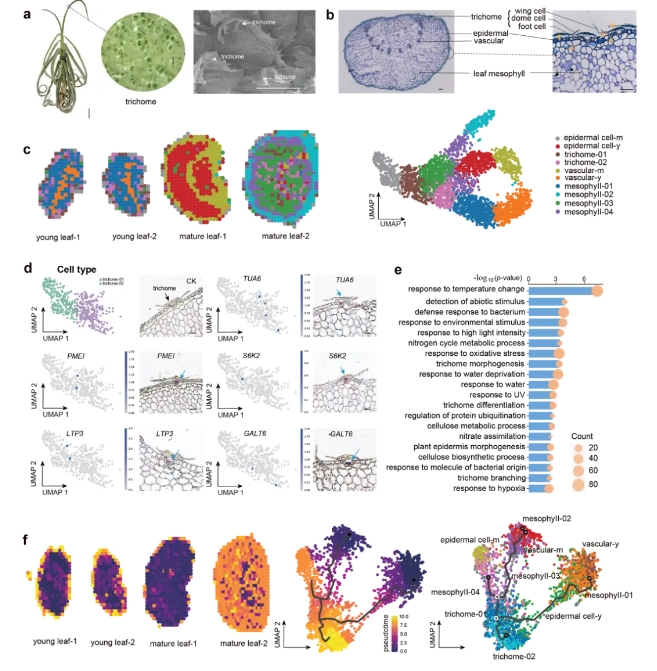 隨著根部失去吸收水分和養(yǎng)分的能力,附生鳳梨科植物的葉片表皮中特化的表皮毛進(jìn)化出了吸收功能,代替根系,實(shí)現(xiàn)了“器官功能互補(bǔ)”。這些多細(xì)胞表皮毛由基部活細(xì)胞和死盾形部分組成,表面覆蓋薄層角質(zhì)層,能夠阻止毛細(xì)管流動(dòng),這對(duì)其吸收功能至關(guān)重要。研究人員通過(guò)大規(guī)模比較基因組分析鑒定出與角質(zhì)合成相關(guān)的三個(gè)關(guān)鍵串聯(lián)重復(fù)基因——CYP96A15(圖5a)。這三個(gè)基因在所有附生鳳梨植物中經(jīng)歷序列變異后被選擇并固定(圖5b)。在原位雜交實(shí)驗(yàn)中,發(fā)現(xiàn)這些CYP96A15重復(fù)基因在表皮毛的頂端和基部細(xì)胞中特異性表達(dá)(圖5c),進(jìn)一步表明它們可能在空氣鳳梨表皮毛吸收功能的獲得中發(fā)揮了關(guān)鍵作用。此外,研究人員還通過(guò)空間轉(zhuǎn)錄組技術(shù),鑒定出多個(gè)在表皮毛細(xì)胞中特異性表達(dá)的基因,為后續(xù)空氣鳳梨表皮毛的研究提供了新的突破口(圖6)。