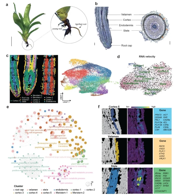 空氣鳳梨的根部功能顯著退化,主要僅發(fā)揮機(jī)械“固著”作用或完全缺失。通過(guò)基因組和比較基因組分析(圖3a-e),研究人員發(fā)現(xiàn)與根發(fā)育相關(guān)的關(guān)鍵基因(如SCR、WER、TTG1、JKD)在附生鳳梨類(lèi)群中發(fā)生了快速進(jìn)化,并受到選擇固定(圖3i-j)。與側(cè)根發(fā)育相關(guān)的AR1基因家族則出現(xiàn)顯著收縮。與根系響應(yīng)重力的關(guān)鍵基因ARG1丟失,而負(fù)調(diào)控基因WG2則受到正向選擇。同時(shí),根系對(duì)水分響應(yīng)的關(guān)鍵基因EN1也發(fā)生喪失。這些結(jié)果表明,空氣植物的進(jìn)化適應(yīng)增強(qiáng)了它們?cè)诖髿馍鷳B(tài)位中的生存能力。此外,利用相同的方法,研究人員還找到了空氣鳳梨耐旱的基因組適應(yīng)性進(jìn)化的關(guān)鍵基因(圖3f-g)和積水類(lèi)型鳳梨蓄水槽形成的關(guān)鍵基因AS1的變異選擇(圖3h)。此外,研究人員通過(guò)空間轉(zhuǎn)錄組分析發(fā)現(xiàn),與次生細(xì)胞壁合成相關(guān)的多個(gè)基因在根被和皮層組織中表現(xiàn)出快速表達(dá),為根系在生長(zhǎng)過(guò)程中迅速木質(zhì)化并發(fā)揮機(jī)械“固著”作用提供了分子基礎(chǔ)(圖4)。