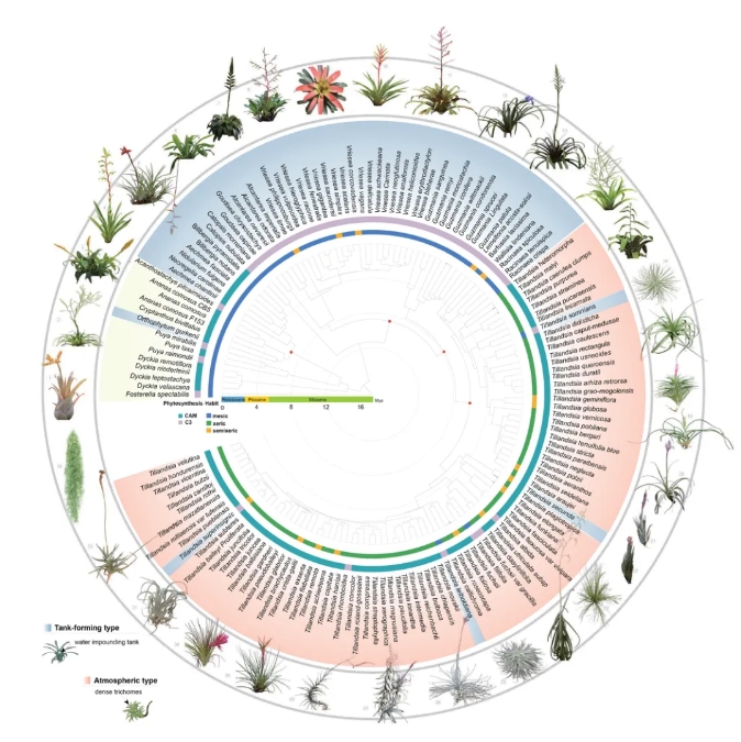 近日,浙江大學(xué)農(nóng)學(xué)院張明方/喻景權(quán)團(tuán)隊(duì)聯(lián)合上海辰山植物園等單位,在Nature Communications期刊上發(fā)表了題為T(mén)racing the evolutionary and genetic footprints of atmospheric tillandsioids transition from land to air的研究成果。該研究采用多組學(xué)方法,解析了空氣鳳梨的起源與進(jìn)化時(shí)間、地點(diǎn),探討了推動(dòng)其進(jìn)化的動(dòng)力學(xué)因素,并揭示了其獨(dú)特適應(yīng)性器官特征的遺傳基礎(chǔ),以及在空中環(huán)境中獲取營(yíng)養(yǎng)的生存策略。