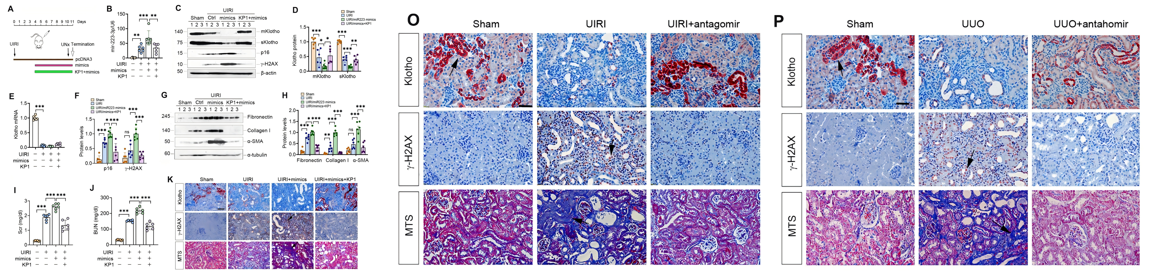 為了證實(shí) miR-223-3p 在 Klotho 表達(dá)中的調(diào)節(jié)作用,作者進(jìn)行了雙熒光素酶報(bào)告基因測(cè)定,轉(zhuǎn)染 miR-223-3p 模擬物降低了含有野生型未突變型 Klotho mRNA 序列的報(bào)告基因的熒光素酶活性,表明 miR-223-3p 可以特異性靶向 Klotho mRNA,抑制其活性,用miR-223-3p轉(zhuǎn)染HK-2細(xì)胞進(jìn)一步證明miR-223-3p抑制 HK-2 細(xì)胞中 Klotho 蛋白的表達(dá)。體內(nèi)模型原位雜交驗(yàn)證了miR-223-3p 在 UIRI 腎腎小管上皮中被誘導(dǎo),而KP1抑制了miR-223-3p表達(dá),結(jié)合免疫熒光染色結(jié)果證明了KP1 可以通過(guò)在體內(nèi)抑制 miR-223-3p 來(lái)恢復(fù) Klotho 表達(dá),在體外的HK-2 細(xì)胞中的miR-223-3p及其拮抗劑轉(zhuǎn)染實(shí)驗(yàn)也呈現(xiàn)出了相同的結(jié)果。