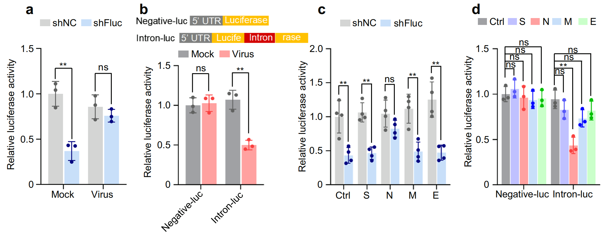 SRSF3hnRNPA3敲除抑制了含有內(nèi)含子的報告基因小基因的剪接,證實了它們確實是剪接因子,而它們的過表達部分緩解了 N 蛋白或 SARS-CoV-2 感染對 RNA 剪接的抑制作用,進一步進行全長轉(zhuǎn)錄組測序,通過可變剪接分析發(fā)現(xiàn),N 蛋白誘導內(nèi)含子保留。此外,RT-qPCR證實,異位 N 蛋白表達或 SARS-CoV-2 感染降低了一組內(nèi)源性內(nèi)含子的剪接效率,SRSF3?和?hnRNPA3?過表達部分減輕了 N 蛋白和 SARS-CoV-2 對 RNA 剪接的抑制作用,這些結(jié)果表明,N 蛋白通過降低?SRSF3?和?hnRNPA3?的表達來抑制 RNA 剪接。