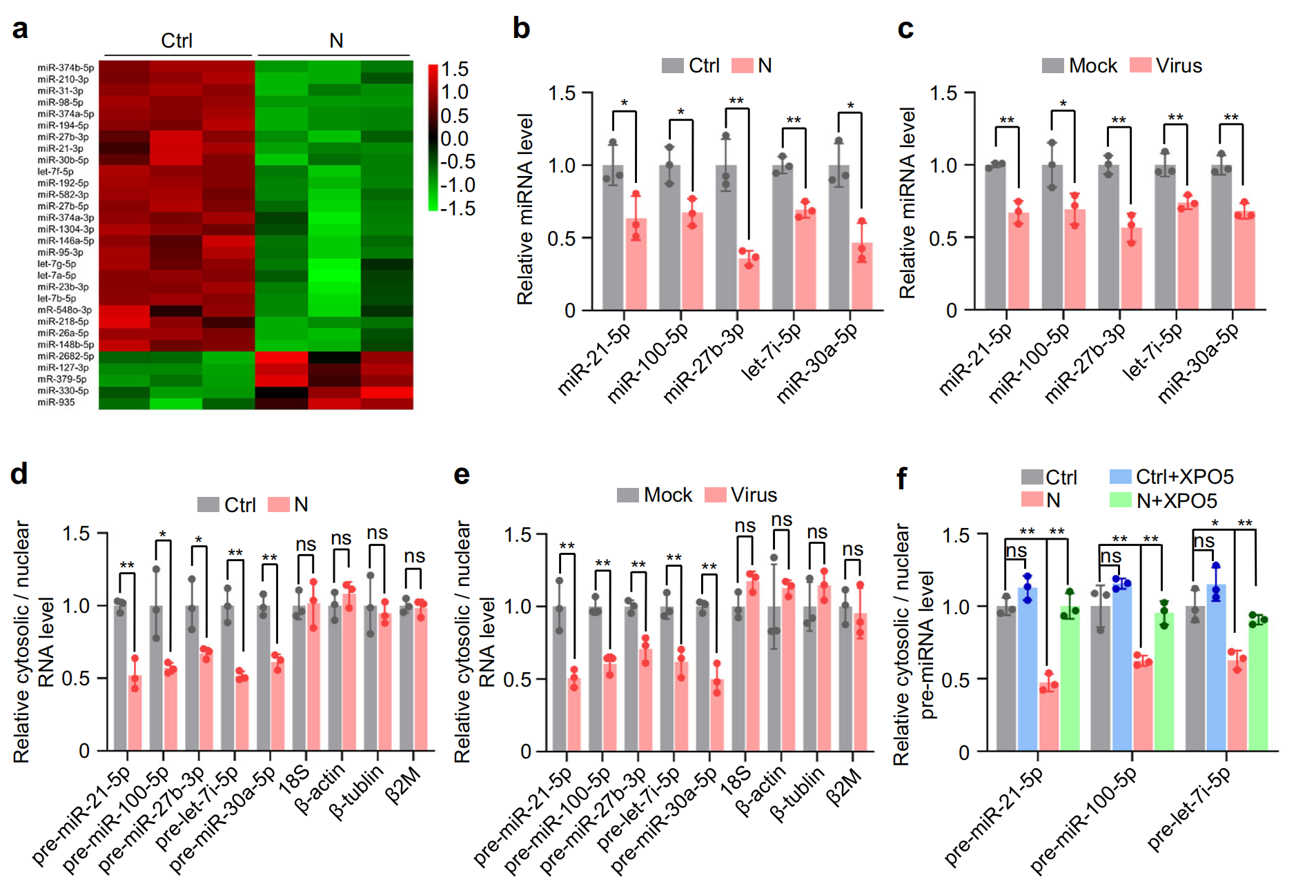 XPO5Dicer在 miRNA 生物合成中起關(guān)鍵作用,小 RNA 深度測序顯示,N 蛋白誘導 miRNA 表達的整體下調(diào),對 A549 和 BEAS-2B 細胞中表達量最高的前五個 miRNA進行定量驗證顯示,它們在表達 N 蛋白的細胞和 SARS-CoV-2 感染的細胞中均下調(diào);生化分級分離實驗顯示,異位 N 蛋白表達或 SARS-CoV-2 感染誘導 pre-miRNA 的核保留,如細胞核中 pre-miRNA 水平的增加和細胞質(zhì)中 pre-miRNA 水平的降低所示,?XPO5過表達后得到緩解。此外,異位 N 蛋白表達或 SARS-CoV-2 感染降低了成熟 miRNA 和 pre-miRNA 之間的比率,Dicer過表達后得到緩解??傮w而言,這些發(fā)現(xiàn)表明,N 蛋白通過降低?XPO5?表達阻斷 pre-miRNA 從細胞核到細胞質(zhì)的運輸,并通過下調(diào)?Dicer?表達抑制 pre-miRNA 向成熟 miRNA 的加工。