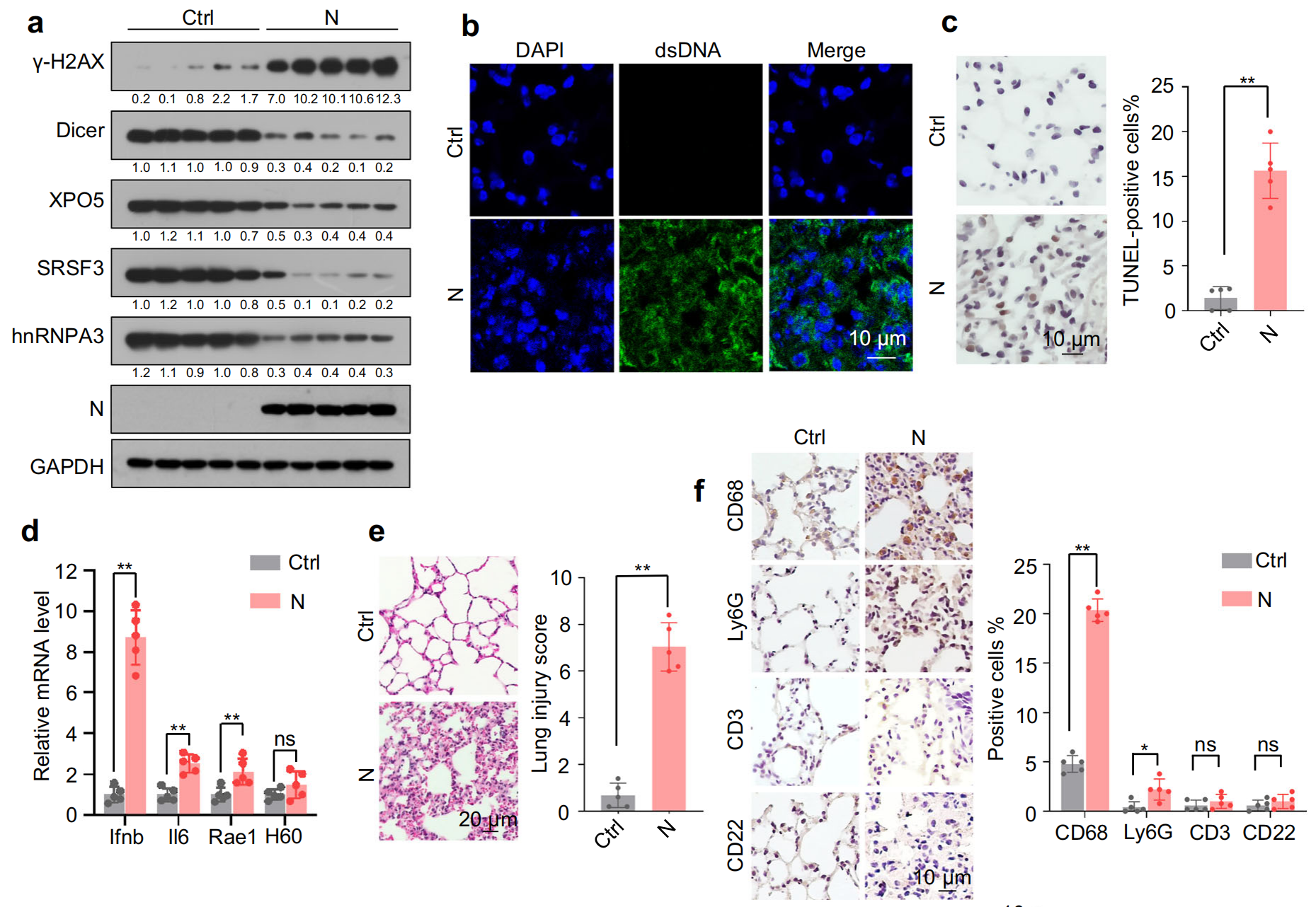 小鼠體內(nèi)驗證結(jié)果顯示, N 蛋白在小鼠肺組織中的表達導致?Dicer、XPO5、SRSF3?和?hnRNPA3?下調(diào)、DNA 損傷、胞質(zhì) DNA 積累、細胞凋亡、IFNβ、IL-6 和 NKG2D 配體上調(diào),以及伴有明顯巨噬細胞浸潤的肺炎,肺組織中?Dicer、XPO5、SRSF3?和?hnRNPA3?敲低導致肺損傷和肺炎,而它們的過表達部分緩解了 N 蛋白誘導的肺炎,這些結(jié)果表明,N 蛋白誘導的?Dicer、XPO5、SRSF3?和?hnRNPA3?蛋白表達下調(diào)是 SARS-CoV-2 誘導肺炎的一種機制。