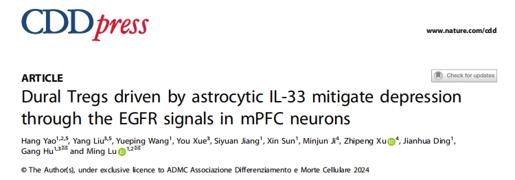 2024年11月,南京醫(yī)科大學(xué)基礎(chǔ)醫(yī)學(xué)院藥理學(xué)系魯明教授、胡剛教授團(tuán)隊(duì)在Cell Death & Differentiation發(fā)表題為”Dural Tregs Driven by Astrocytic IL-33 Mitigate Depression Through the EGFR Signals in mPFC Neurons”的研究論文,使用單細(xì)胞轉(zhuǎn)錄組測(cè)序技術(shù)等多種技術(shù),深入闡述小鼠硬腦膜免疫細(xì)胞的抗抑郁機(jī)制,為抑郁癥治療提供了新的潛在治療靶點(diǎn)。接下來(lái)是本文的詳細(xì)解讀。