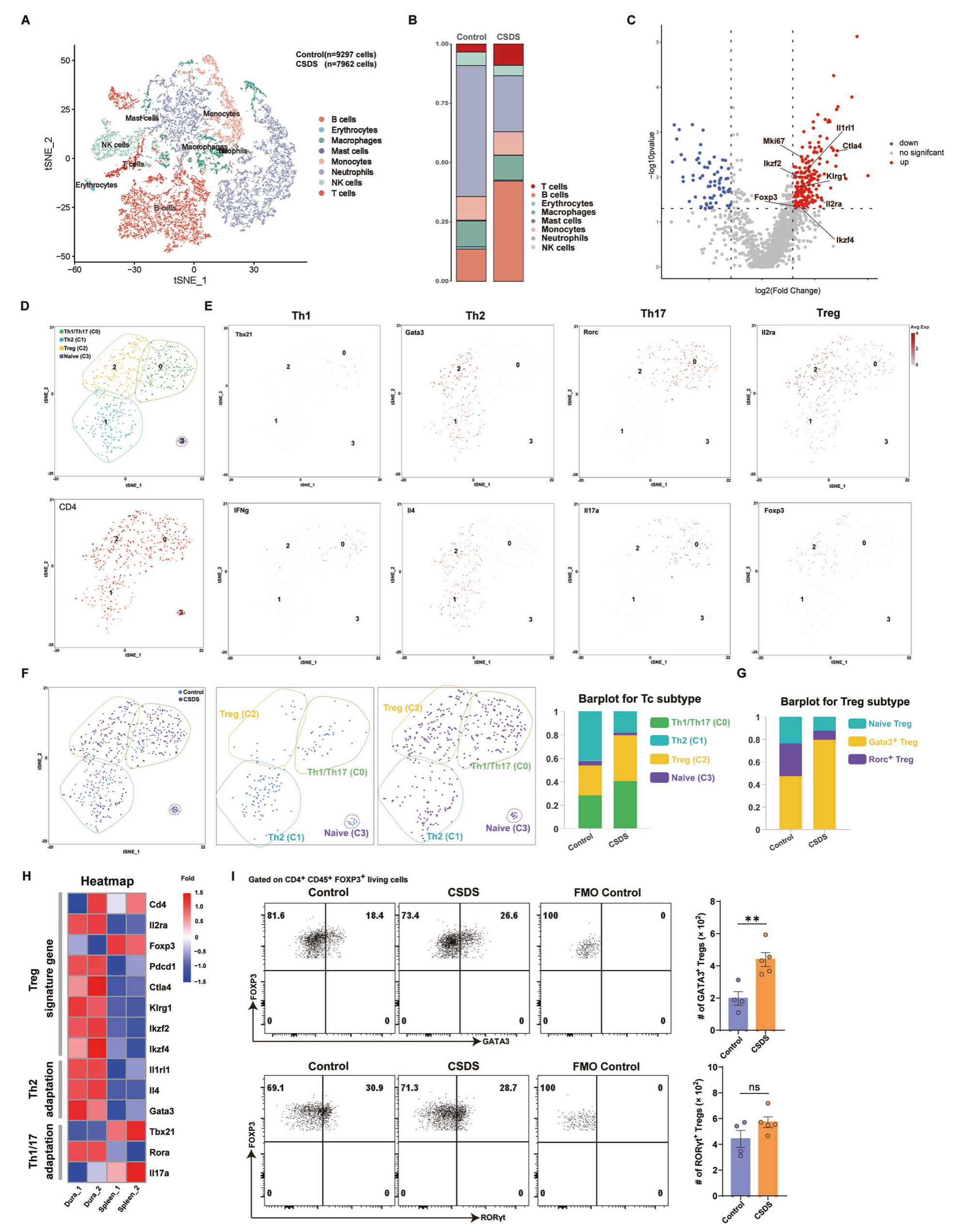 CSDS小鼠和對(duì)照組小鼠硬腦膜分選得到的免疫細(xì)胞進(jìn)行scRNA-seq,結(jié)果顯示CSDS小鼠硬腦膜T細(xì)胞占比增加,其中Treg和Th17比例增加,Th2比例降低,初始T細(xì)胞沒(méi)有發(fā)生變化;Treg中,Gata3+?Treg比例提高,初始Treg和Rorx+?Treg比例降低。對(duì)照組小鼠硬腦膜和脾臟分選得到Treg進(jìn)行SMART-seq,發(fā)現(xiàn)與脾臟相比,硬腦膜Treg的Gata3+亞型和Rora+亞型相關(guān)基因表達(dá)上調(diào)。流式細(xì)胞術(shù)進(jìn)一步證實(shí)CSDS小鼠硬腦膜中GATA3+?Treg顯著增加,RORγt+?Treg數(shù)量無(wú)顯著變化。這些表明GATA3+ Treg可能參與抑郁表現(xiàn)的調(diào)控。