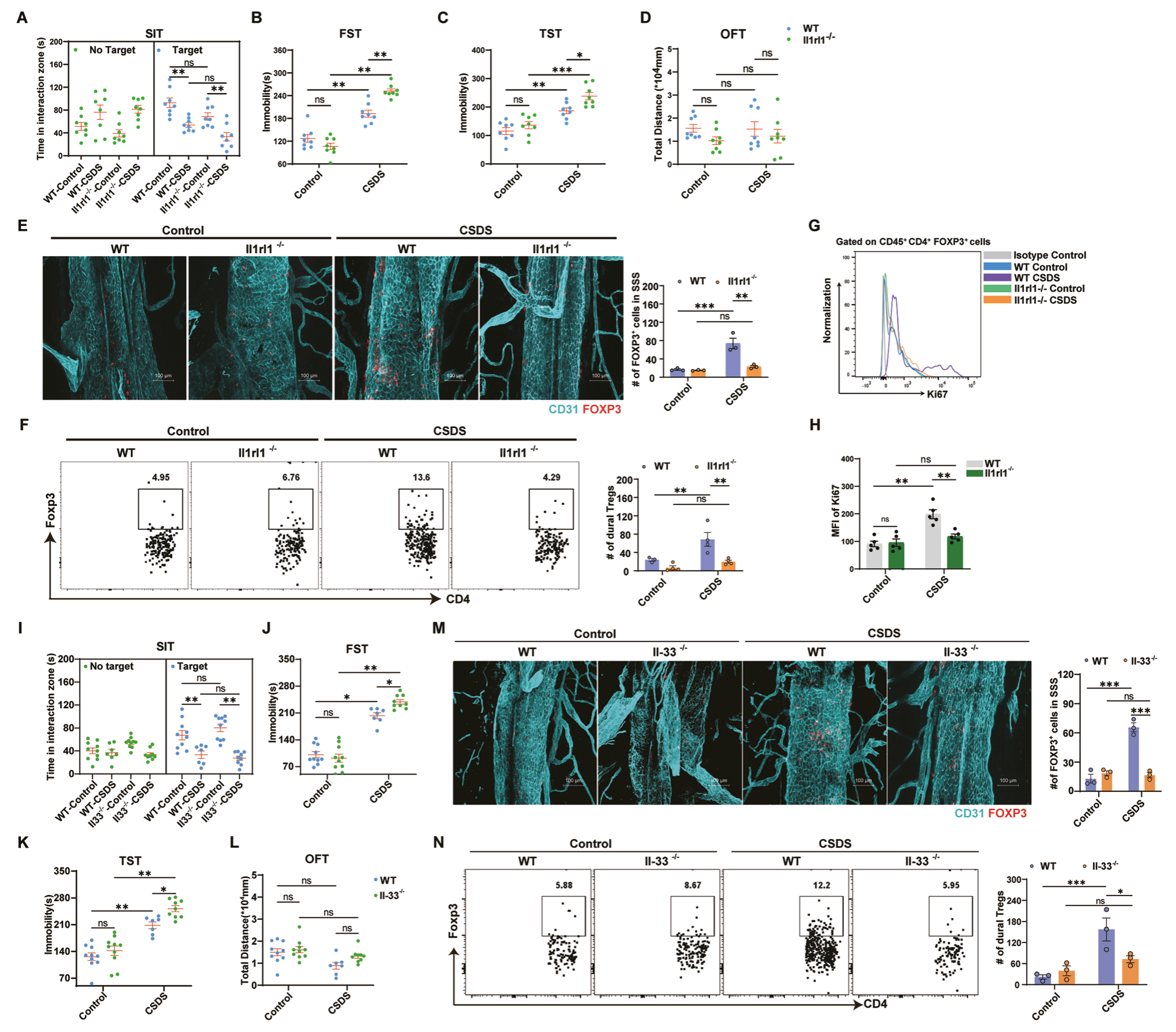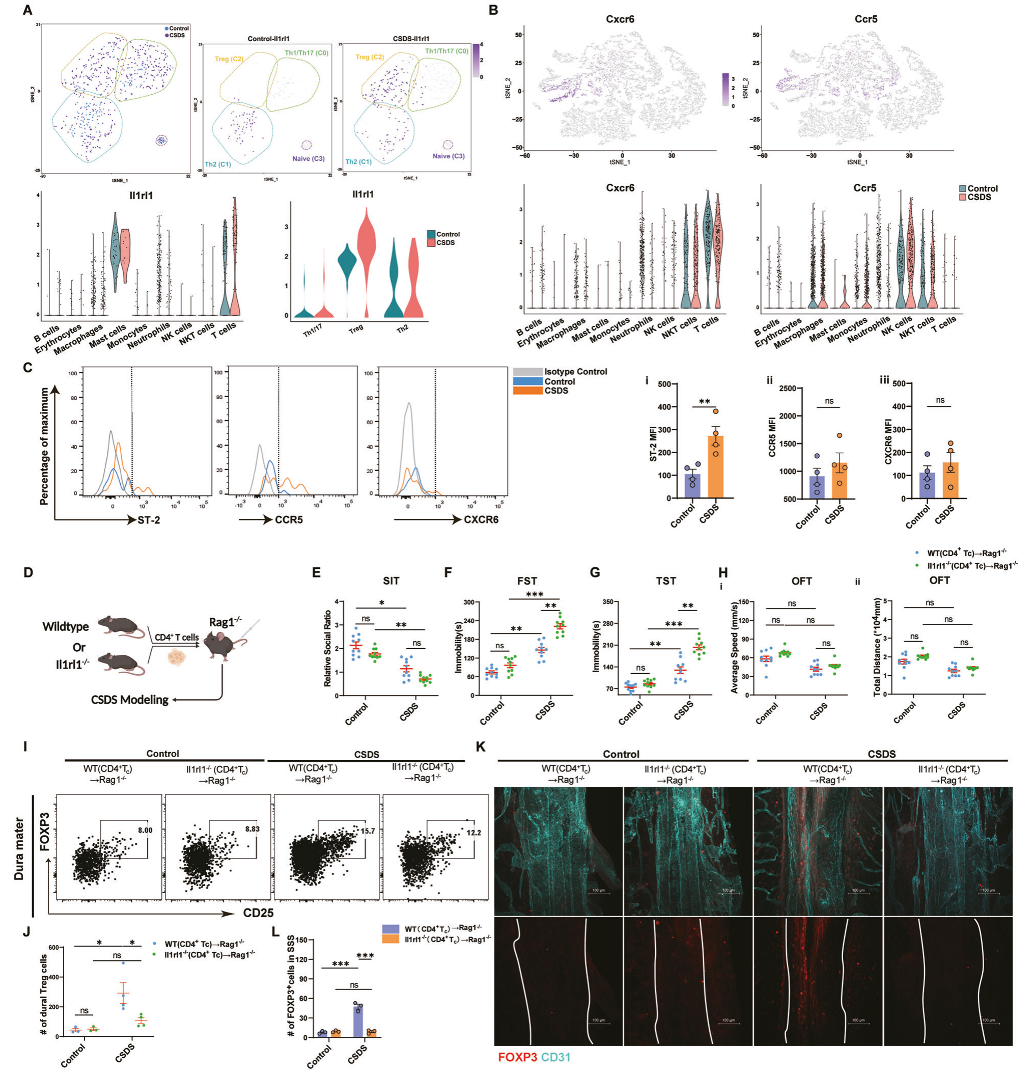 SMART-seq數(shù)據(jù)顯示CSDS小鼠硬腦膜“IL33結(jié)合”以及其他內(nèi)源性分子結(jié)合信號(hào)通路表達(dá)上調(diào);與脾臟相比,CSDS小鼠硬腦膜中表達(dá)ST2的細(xì)胞比例顯著高于脾臟;硬腦膜Treg富集趨化性通路。scRNA-seq數(shù)據(jù)也顯示CSDS小鼠模型中T淋巴細(xì)胞聚群高表達(dá)ST2編碼基因,且表達(dá)水平高于對(duì)照組小鼠的T淋巴細(xì)胞;CSDS小鼠模型硬腦膜Treg高表達(dá)ST2編碼基因。隨后,研究者將WT小鼠和Il1rl1-/-小鼠硬腦膜Treg細(xì)胞轉(zhuǎn)移到Rag1-/-小鼠并構(gòu)建CSDS模型,行為學(xué)等實(shí)驗(yàn)結(jié)果證實(shí),ST2表達(dá)是硬腦膜Treg招募和擴(kuò)張所必須的。IL33-/-小鼠相關(guān)實(shí)驗(yàn)也支持了IL33/ST2信號(hào)在抑郁期間促進(jìn)硬腦膜Treg增殖。