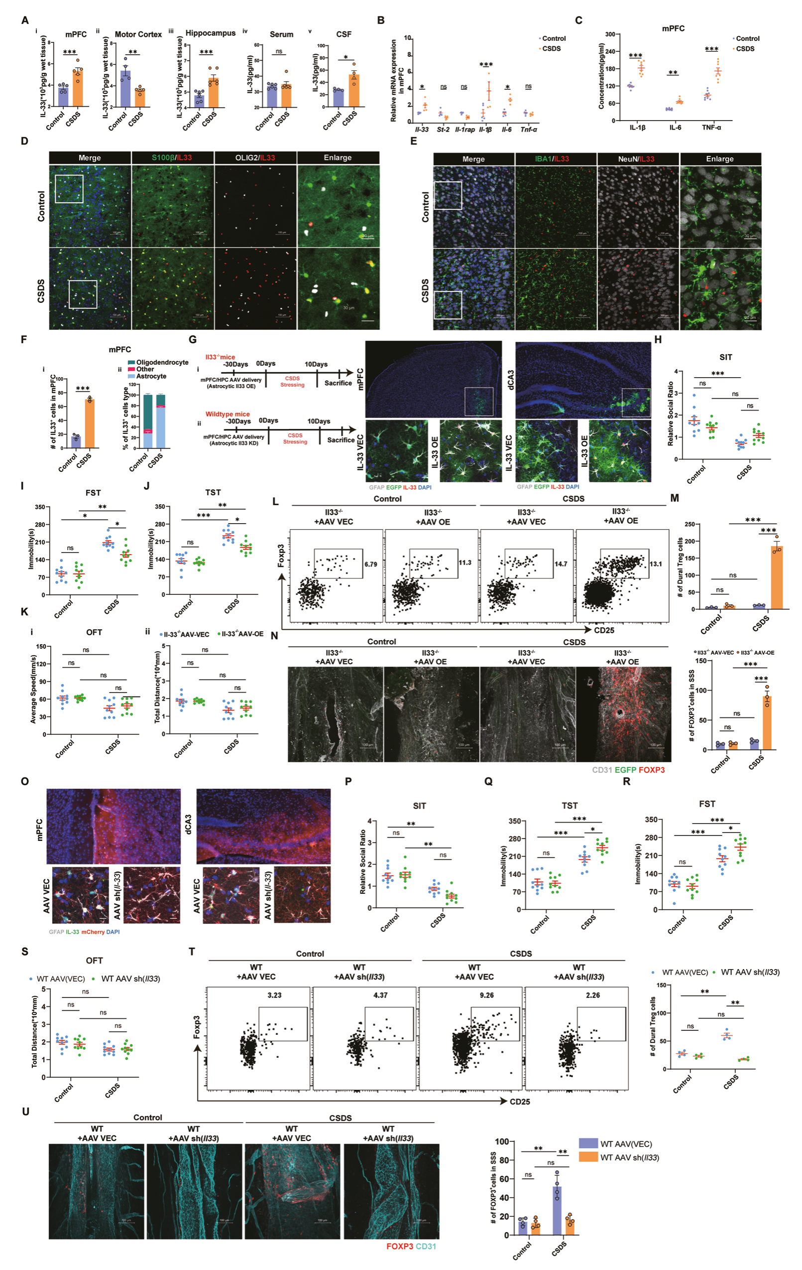 mPFC、海馬、腦脊液等組織的ELISA、qPCR以及Western blot實(shí)驗(yàn)結(jié)果表明,CSDS小鼠硬腦膜ST2+ Treg激活所需的IL33來(lái)源于腦實(shí)質(zhì)而不是硬腦膜。多重免疫熒光結(jié)果表明mPFC處星形細(xì)胞是IL33增加的主要貢獻(xiàn)細(xì)胞類型。進(jìn)一步的特異性細(xì)胞類型IL33基因表達(dá)KO-恢復(fù)實(shí)驗(yàn)及相應(yīng)的行為學(xué)實(shí)驗(yàn)、流式細(xì)胞術(shù)等結(jié)果表明,主要是星形細(xì)胞來(lái)源的IL33介導(dǎo)了CSDS小鼠中硬腦膜Treg的產(chǎn)生。