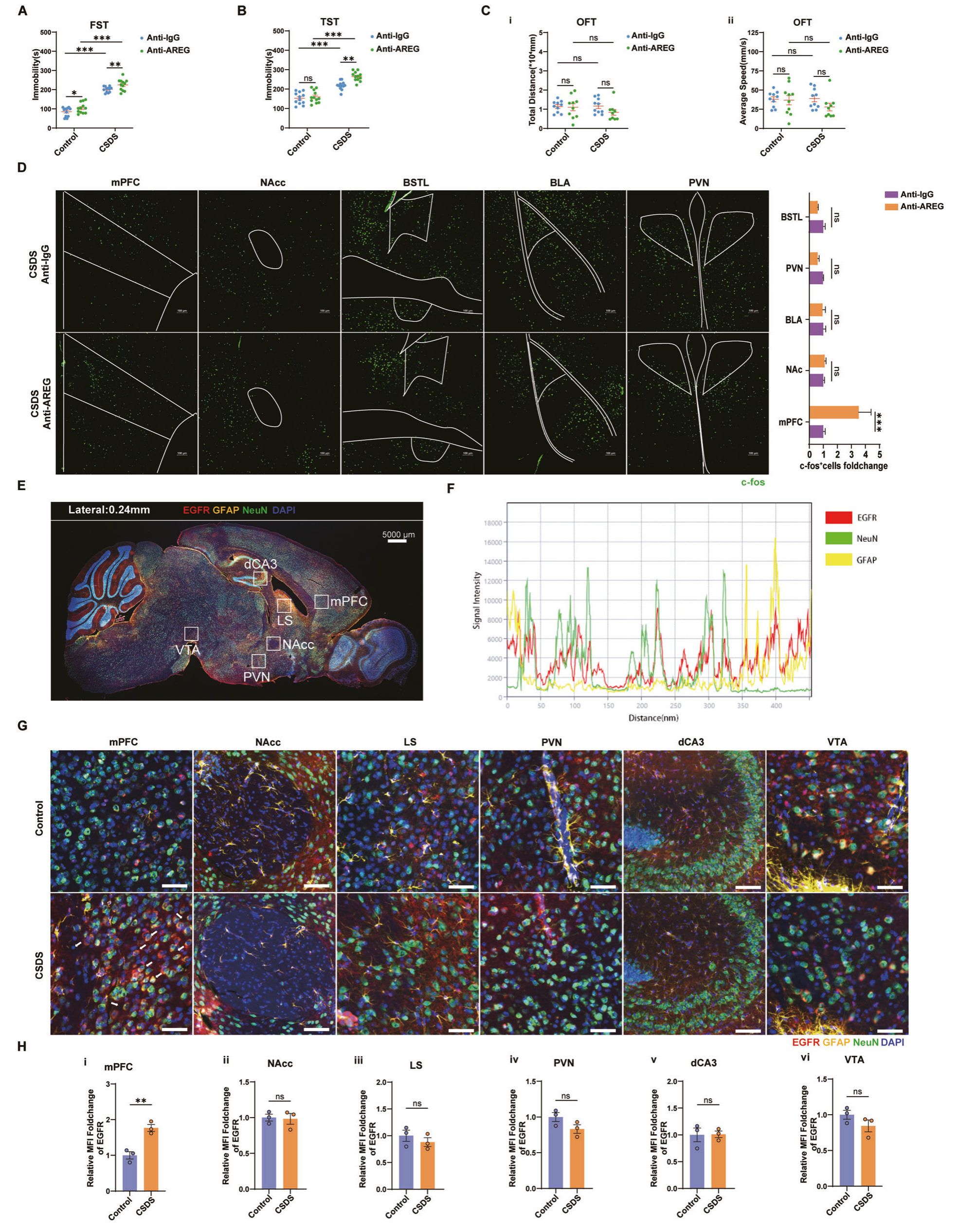 腦免疫熒光掃描結(jié)果表明硬腦膜來(lái)源的AREG可能特異性的影響mPFC神經(jīng)元活性,TSA多重染色等實(shí)驗(yàn)結(jié)果表明,CSDS應(yīng)激顯著誘導(dǎo)mPFC神經(jīng)元EGFR(AREG是EGFR配體)的表達(dá),硬腦膜AREG去除可顯著抑制mPFC的EGFR激活,小腦延髓池注射的AREG中和抗體只去除了硬腦膜AREG但對(duì)mPFC腦區(qū)AREG無(wú)顯著影響。通過(guò)這些結(jié)果,研究者假設(shè)神經(jīng)元表達(dá)EGFR可以接收硬腦膜Treg來(lái)源的AREG,并激活EGFR信號(hào),直接影響神經(jīng)元活性。