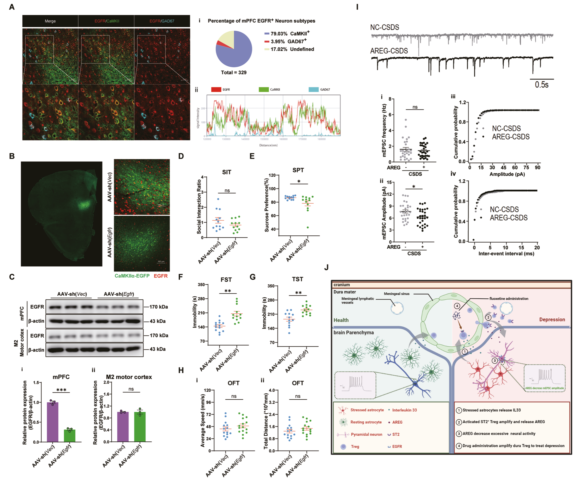 為了驗(yàn)證這一假設(shè),研究者使用AAV抑制mPFC錐體神經(jīng)元EGFR的表達(dá),免疫熒光、Western blot等實(shí)驗(yàn)結(jié)果表明,敲除EGFR部分地加重CSDS小鼠抑郁表現(xiàn),應(yīng)激誘導(dǎo)的抑郁中mPFC神經(jīng)元EGFR信號(hào)起到重要作用,揭示mPFC錐體神經(jīng)元是硬腦膜Treg來(lái)源AREG的靶細(xì)胞。