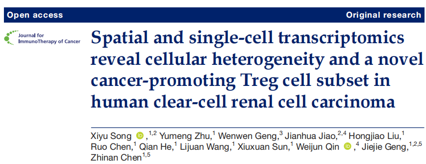 英文標(biāo)題:Spatial and single-cell transcriptomics reveal cellular heterogeneity and a novel cancer-promoting Treg cell subset in human clear-cell renal cell carcinoma