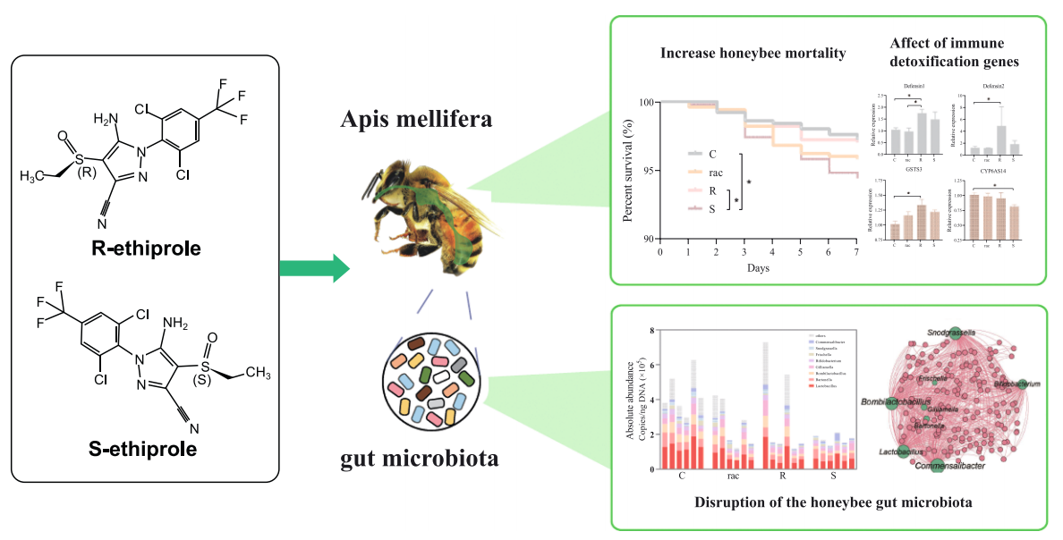 蜜蜂是重要的傳粉者,在覓食過程中容易受到外部病原體和農(nóng)藥的影響。手性乙蟲腈作為一種重要的農(nóng)藥,廣泛用于農(nóng)業(yè)生產(chǎn),但其對(duì)蜜蜂的副作用尚不清楚。該研究分析了三種形式的乙蟲腈(rac-乙蟲腈、R-乙蟲腈和S-乙蟲腈)對(duì)蜜蜂及其腸道微生物的毒性。結(jié)果表明,乙蟲腈對(duì)映體對(duì)傳粉者具有潛在的毒性,并為農(nóng)業(yè)中農(nóng)藥的安全合理使用提供了依據(jù)。