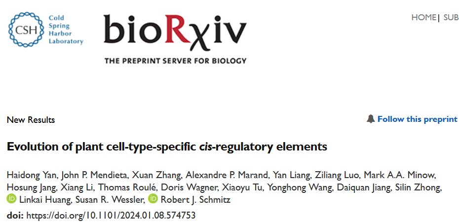[4] Yan H, Mendieta JP, Zhang X, et al. Evolution of plant cell-type-specific cis-regulatory elements[J]. bioRxiv, 2024. doi: https://doi.org/10.1101/2024.01.08.574753.