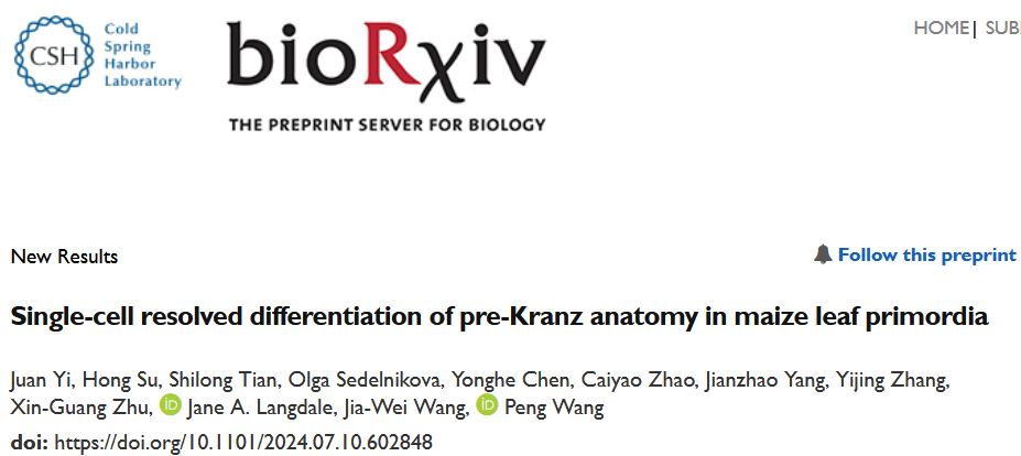 [5] Yi J, Su H, Tian S, et al. Single-cell resolved differentiation of pre-Kranz anatomy in maize leaf primordia[J]. bioRxiv, 2024. doi: https://doi.org/10.1101/2024.07.10.602848.
