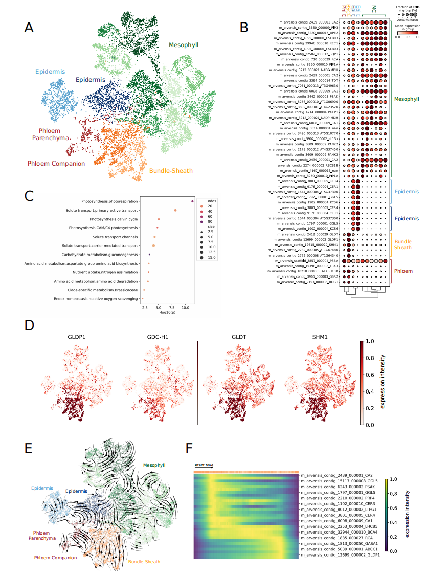 ② 該研究利用最近在單細胞轉(zhuǎn)錄組測序方面的進展,更好地理解新的細胞特化如何影響相互關(guān)聯(lián)的途徑。研究人員為具有C3-C4中間特征的堇娘芥(Moricandia arvensis)生成了單細胞核RNA測序數(shù)據(jù)集,并將其與公開可用的C3擬南芥(Arabidopsis thaliana)葉組織的單細胞轉(zhuǎn)錄組進行了比較,還通過免疫金標記技術(shù)結(jié)合電子顯微鏡獨立驗證了選定光呼吸蛋白的定位。