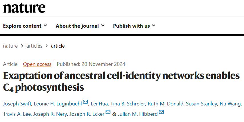 [3] Swift J, Luginbuehl LH, Hua L, et al. Exaptation of ancestral cell-identity networks enables C4 photosynthesis[J]. Nature, 2024, 636: 143-150.