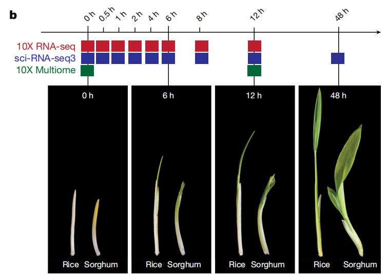 單細胞核轉(zhuǎn)錄組:水稻和高粱幼苗暗生長5天后,在光周期(12h光/12h暗)中采集0h(暗)、0.5h、1h、2h、4h、6h、8h、12h、48h共9個時間點的地上組織??傆嬎?90,569個核、高粱265,701個核。