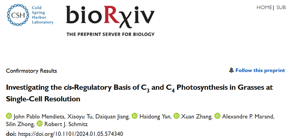 [1] MENDIETA J P, TU X, JIANG D, et al. Investigating the cis-regulatory basis of C3?and?C4 photosynthesis in grasses at single-cell resolution[J]. bioRxiv, 2024-01-05. DOI: 10.1101/2024.01.05.574340.