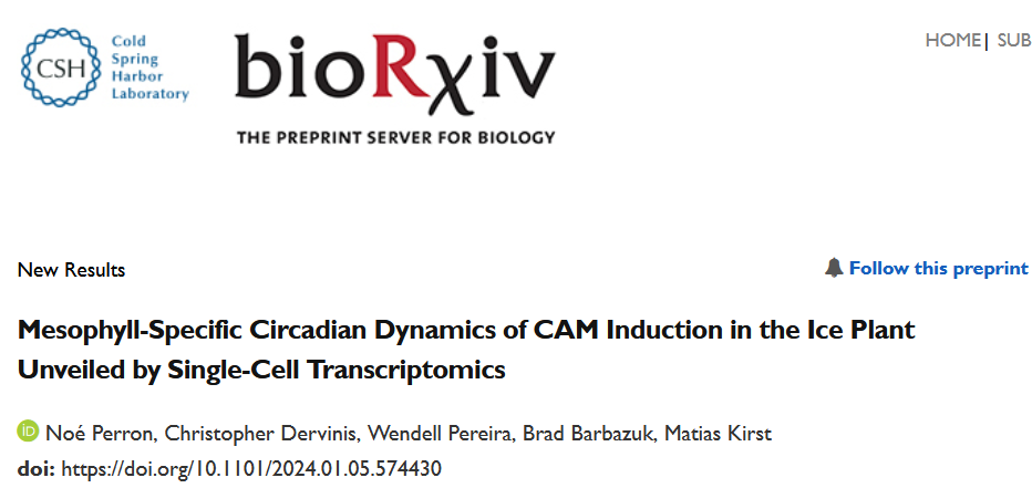 [2] PERRON N, DERVINIS C, PEREIRA W, et al. Mesophyll-specific circadian dynamics of CAM induction in the ice plant unveiled by single-cell transcriptomics[J]. bioRxiv, 2024-01-05. DOI: 10.1101/2024.01.05.574430.