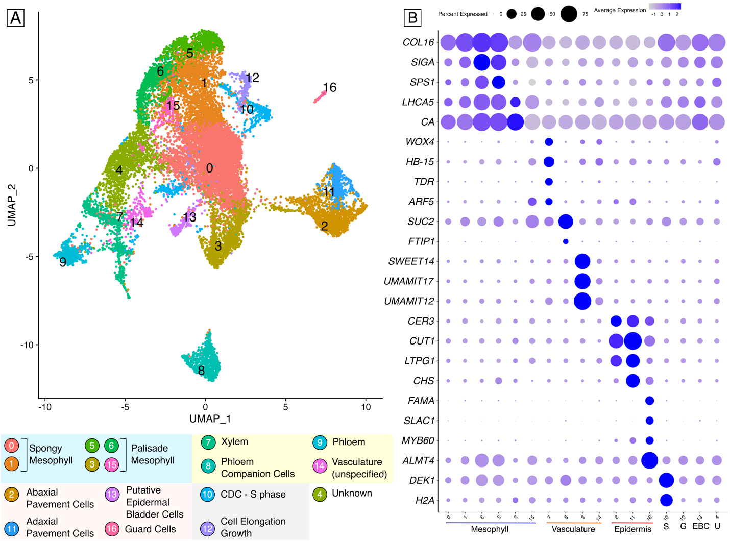 單細胞核測序:共獲取17,994個高質(zhì)量核,注釋17個細胞簇,覆蓋葉肉(海綿/柵欄)、表皮、保衛(wèi)細胞、木質(zhì)部、韌皮部等