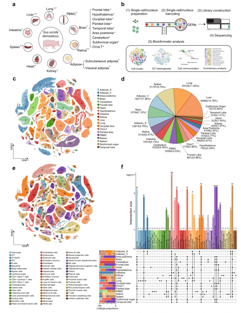 ① 使用單細(xì)胞轉(zhuǎn)錄組測(cè)序及單細(xì)胞核轉(zhuǎn)錄組測(cè)序,構(gòu)建家豬多器官單細(xì)胞圖譜,得到234種降維聚類(lèi)簇,鑒定出58種細(xì)胞類(lèi)型及其相關(guān)的顯著富集標(biāo)志基因,搭建了可視化家豬單細(xì)胞轉(zhuǎn)錄組數(shù)據(jù)庫(kù)(Pig Single Cell Atlas Database)。