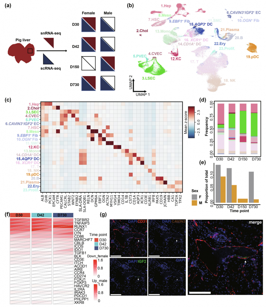 單細(xì)胞轉(zhuǎn)錄組,出生后不同胎齡豬肝臟,D30(n = 3),D42 (n = 3),D150(n = 1),D730(n = 2)。