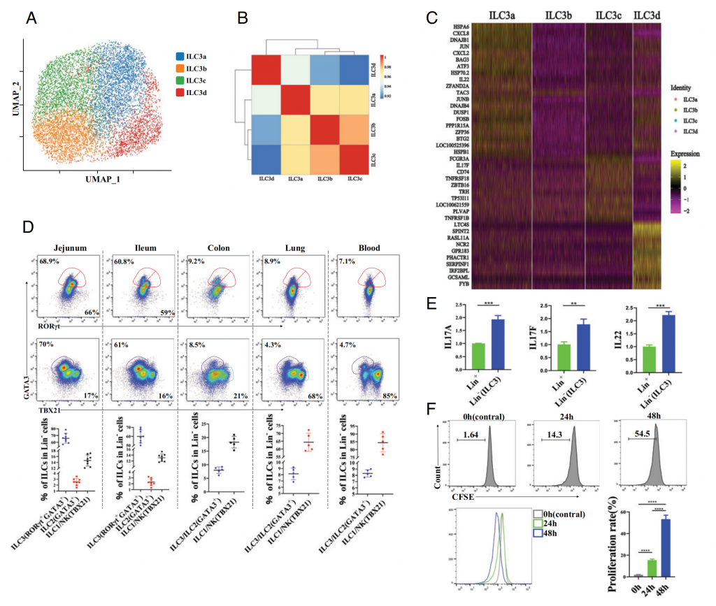 ④ 與小鼠相比,人類(lèi)和豬腸道ILC轉(zhuǎn)錄上是保守的,一些ILC標(biāo)志基因在人、豬和小鼠中都表達(dá),但豬空腸ILC中也發(fā)現(xiàn)一些特異性表達(dá)基因。人類(lèi)和豬腸道ILC組成高度相似(主要是ILC3,ILC2幾乎不存在),但小鼠中ILC2占比高??傊琁LC的跨物種數(shù)據(jù)分析和比較,為后續(xù)豬作為人類(lèi)醫(yī)學(xué)研究模型提供了基礎(chǔ),特別是關(guān)注ILC相關(guān)細(xì)胞和腸粘膜免疫疾病的研究。
