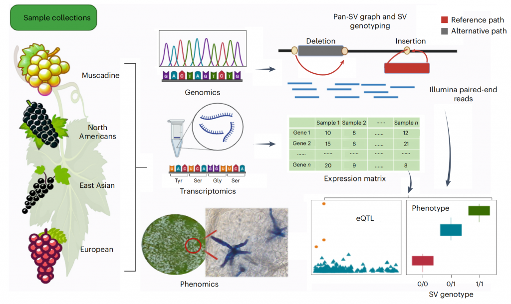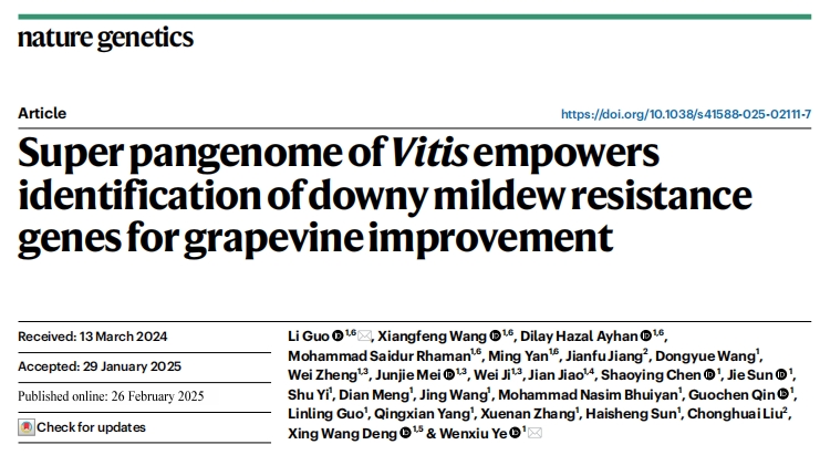 2025年02月26日,濰坊現(xiàn)代農(nóng)業(yè)山東省實驗室、北京大學現(xiàn)代農(nóng)業(yè)研究院葉文秀研究員和郭立研究員團隊在國際期刊《自然-遺傳學(Nature Genetics)》上在線發(fā)表了題為Super pangenome of Vitis?empowers identification of downy mildew resistance genes for grapevine improvement的研究成果。作為葡萄科研領(lǐng)域里程碑式的重大突破,繪制了涵蓋葡萄屬的歐亞、北美和東亞世界三大種群的72個葡萄種質(zhì)材料的單倍型超級泛基因組圖譜,揭示葡萄屬豐富遺傳多樣性和雜交歷史,基于葡萄多組學數(shù)據(jù),挖掘到葡萄霜霉病抗性相關(guān)遺傳變異和抗病基因,加速葡萄精準分子育種,開啟葡萄種質(zhì)創(chuàng)新和利用新時代。百邁客生物為該研究提供了基因組、hic、轉(zhuǎn)錄組等測序服務(wù)。