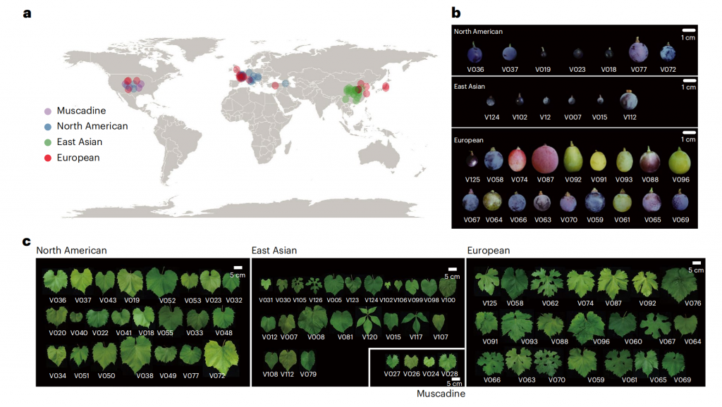 圖1-葡萄樣品全球地理分布及其果實和葉片形態(tài)