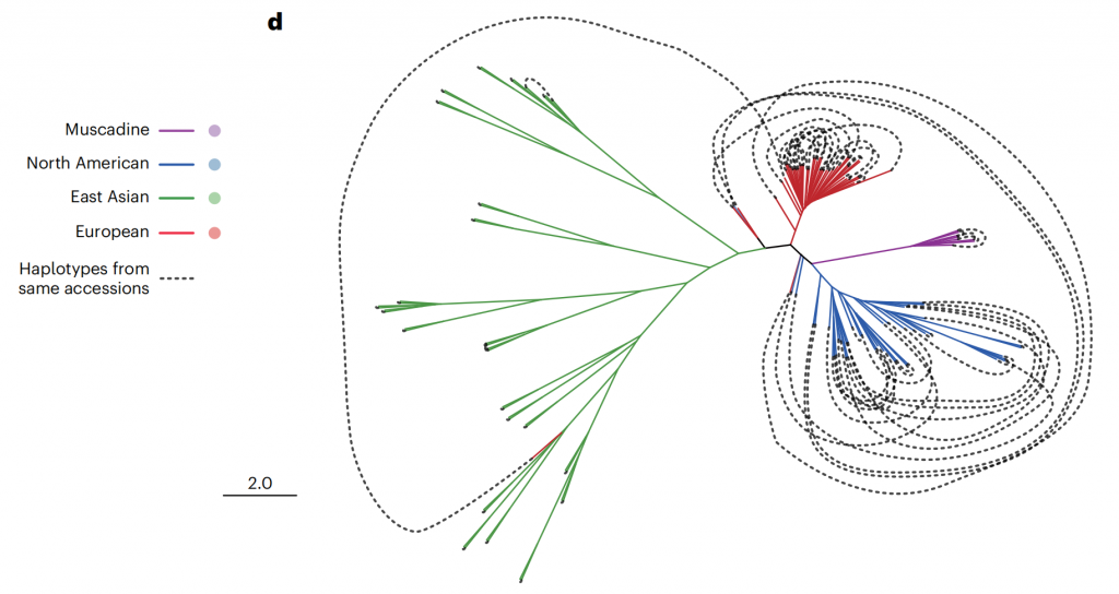 鑒于葡萄基因組因頻繁雜交而具有的高度雜合性,單倍型基因組不僅能精確解析雜合區(qū)域序列,而且對分析葡萄的育種歷史也至關(guān)重要。該研究構(gòu)建了單倍型系統(tǒng)發(fā)育進化樹,揭示了葡萄屬植物復(fù)雜的育種歷史和豐富的遺傳多樣性。結(jié)果顯示,北美和歐洲品種存在較多內(nèi)部雜交,而東亞品種的內(nèi)部雜交較少,跨大洲雜交事件有限(圖2)。特別是東亞葡萄極少被開發(fā)的遺傳多樣性,表明了其潛在的巨大育種價值。此次發(fā)布的東亞野生葡萄基因組為葡萄遺傳育種研究提供了強有力的資源支持。