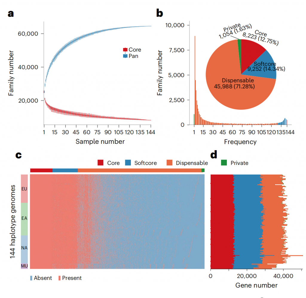 葡萄作為最古老的馴化作物之一(約公元前11,000年),漫長的持續(xù)馴化和多年的育種改良導致現(xiàn)代葡萄品種的遺傳多樣性縮小和抗性丟失,使其易受病蟲、逆境等各種不利條件的影響。近年北美葡萄泛基因組(Genome biology, 2023),歐洲葡萄泛基因組(Nature Genetics, 2024)的相繼報道,野生葡萄以其豐富的遺傳多樣性和超強的抗性基因再次受到關(guān)注,但以大群體染色體級基因組組裝為基礎(chǔ),涵蓋主要品種,特別是包含東亞野生種葡萄的屬級泛基因組一直未見報道。因此構(gòu)建涵蓋整個葡萄屬的泛基因組將成為了解葡萄遺傳多樣性、開展功能基因組學研究、識別隱性遺傳特性以及葡萄精準改良的關(guān)鍵資源。