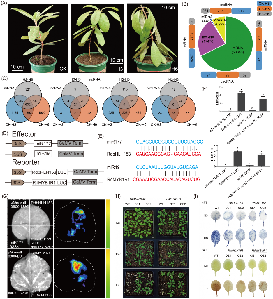 圖2. miRNA和靶基因的全轉(zhuǎn)錄組分析及功能驗(yàn)證 (A)R. delavayi的對(duì)照(CK)和熱處理(H3和H6);(B)mRNA、lncRNA、miRNA和circRNA的鑒定和差異表達(dá)分析;(C)三種比較中特異性和常見的差異表達(dá)RNA;(D)效應(yīng)器和報(bào)告器結(jié)構(gòu)圖;(E)miR49和miR177靶點(diǎn)突變示意圖;(F)熒光素酶測(cè)定統(tǒng)計(jì)。誤差條表示三個(gè)重復(fù)的SEs(*,p?< 0.05)。(G)熒光素酶成像分析;(H)RdbHLH153和RdMYB1R1的過(guò)表達(dá)增強(qiáng)了耐熱性。NS表示無(wú)熱應(yīng)激,HS-A表示36 h熱應(yīng)激,HS-R表示36 h熱處理后在常溫下恢復(fù)5天;(I)二氨基聯(lián)苯胺(DAB)和硝基藍(lán)四氮唑(NBT)染色法檢測(cè)轉(zhuǎn)基因株系和WT在無(wú)熱脅迫(NS)和熱脅迫(HS)下的H2O2和O?2。
