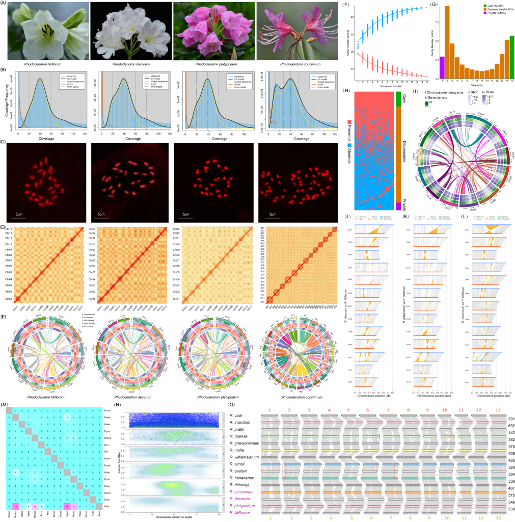 圖 1. 4種杜鵑屬及11種已發(fā)表杜鵑屬植物的基因組分析 (A)四種杜鵑花的開花照片;(B)通過(guò)k-mer進(jìn)行基因組調(diào)查。(C)流式細(xì)胞術(shù)檢測(cè)染色體核型;(D)基因組組裝的Hi-C接觸圖;(E)轉(zhuǎn)座子、SSR、基因密度和GC含量在染色體上的分布;(F)核心(紅色)和非核心(藍(lán)色)基因家族數(shù)量趨勢(shì)圖;(G)核心集群、可有可無(wú)集群和私有集群的家族數(shù)量;(H)核心、可有可無(wú)和私有集群的存在和缺失分析;(I)百合杜鵑花基因組中基因密度、SNP和InDel變異的分布情況;(J-L)以T2T基因組為參照,研究了端粒紅豆杉、鴨嘴獸和短柄紅豆杉基因組的同源性和重排;(M)兩個(gè)物種之間共享LTR的比例(Rconc:?R. concinnum; Rdeco:?R. decorum; Rdela:?R. delavayi; Rgrie:?R. griersonianum; Rhena:?R. henanense; Rirro:?R. irroratum; Rlili:?R. liliiflorum; Rmoll:?R. molle; Rovat:?R. ovatum; Rplat:?R. platypodum; Rprat:?R. prattii; Rripe:?R. ripense; Rsims:?R. simsii; Rvial:?R. vialii; Rwill:?R. williamsianum);(N)LTR在染色體上的分布。x軸代表染色體位置的百分比,y軸代表LTR的插入時(shí)間;(O)15種杜鵑屬植物的基因組共線性。右邊的數(shù)字表示共線塊編號(hào)。